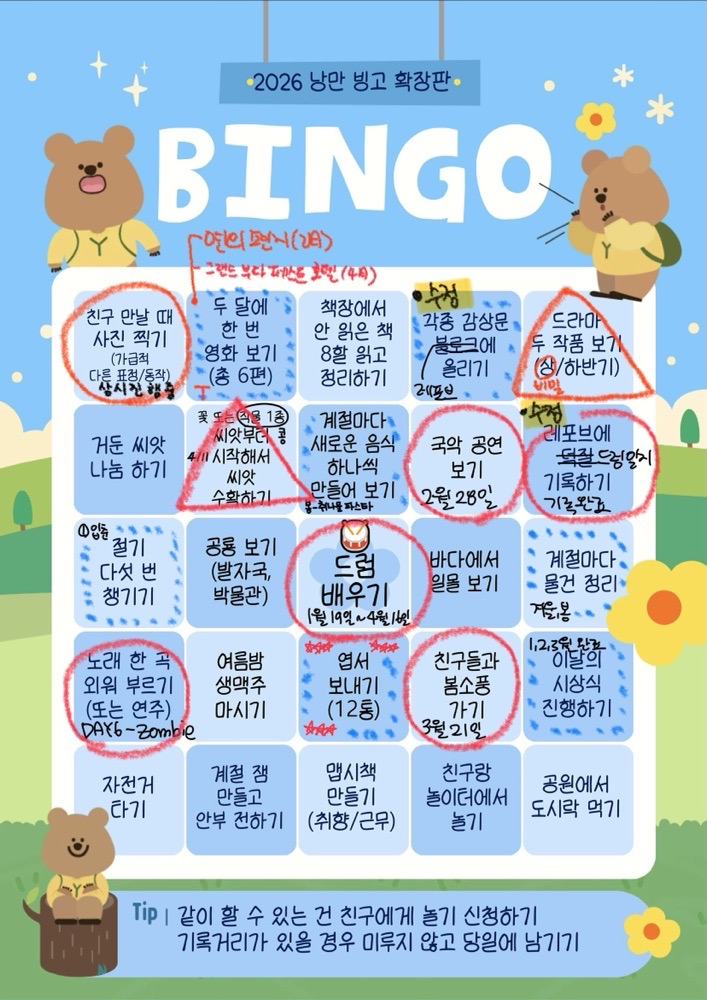 001. 올해 초. 삶을 좀 다채롭게, 생기있게 살아보고 싶어서 빙고를 만들었다. 이름하야 낭만 빙고. 생산성을 제외한, 정말 ‘낭만’ 또는 ‘로망’, 또는 ‘사소한’ 빙고를 만들었다. 친구들에게 같이 하자고 권했는데 감사하게도 응해줘서 연말에 각자의 빙고판을 들고 만나기로 했다. 친구들은 9빙고, 나는 9빙고에서 확장해서 25빙고다. 올해의 1/3이 되어가는 이맘때, 생각보다 이룬게 많아서 올려본다. 앞으로 빙고 달성하면 레포브에도 올릴 생각.