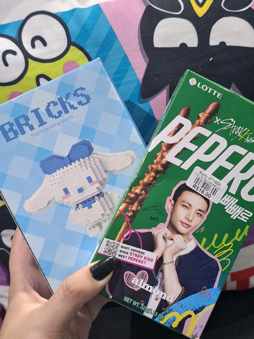 hoje foi dia de bater perna no centro hehehe dei uma passada no busca busca shopping e comprei uns ganchinhos de gatinho, lá é bem mais organizado que o outro mas falta muita coisa ainda pra eles arrumarem. parei nesse stand com vários tipos de comida pra almoçar e tive que ajudar meu namorado a comer o macarrão dele pq tava apimentado demais, aí entrei numa lojinha só pra comprar esse pepero que ainda não tinha provado e saí de lá com 5 cartelas de adesivo da hello kitty (segue meu mini teclado fofinho no final) e esse "lego" do cinnamon roll, quando eu terminar de montar posto ele e a minha hello kitty aqui!