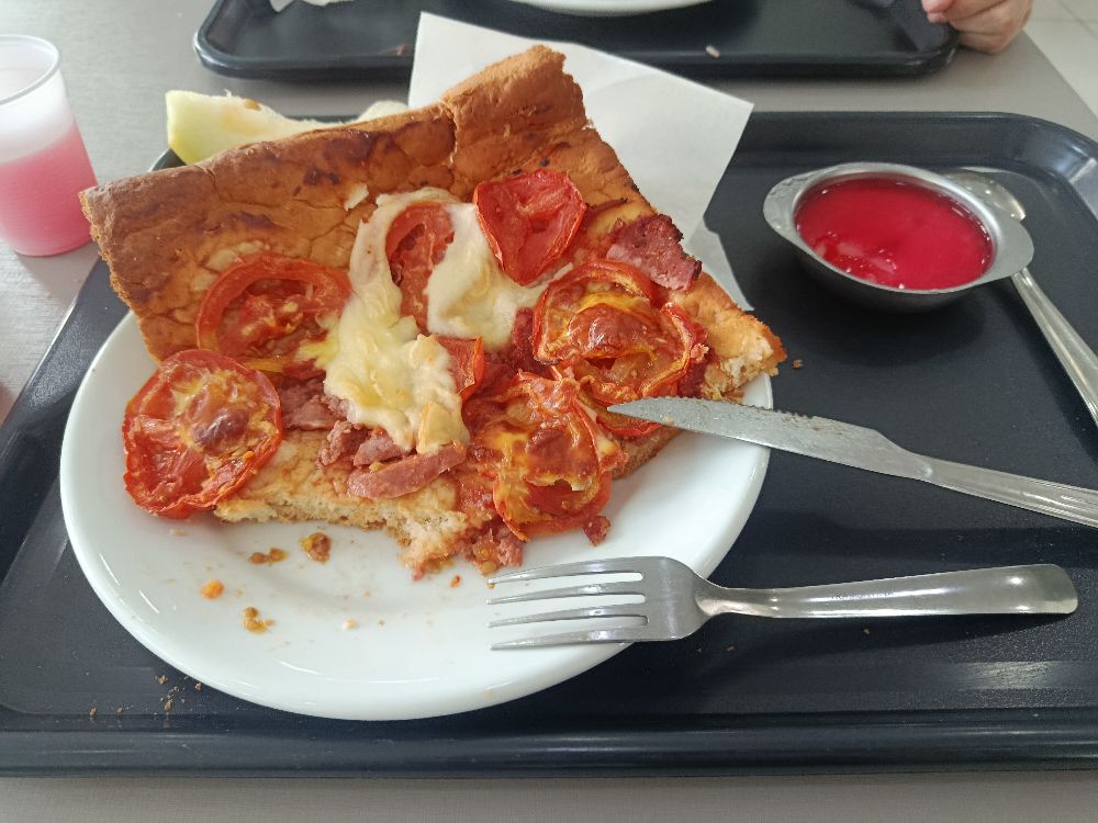 Mas terças e sextas temos almoço diferente, e hoje foi pizza e gente o tamanho KKKKK e tava bom 🙂↕️🫴🏻