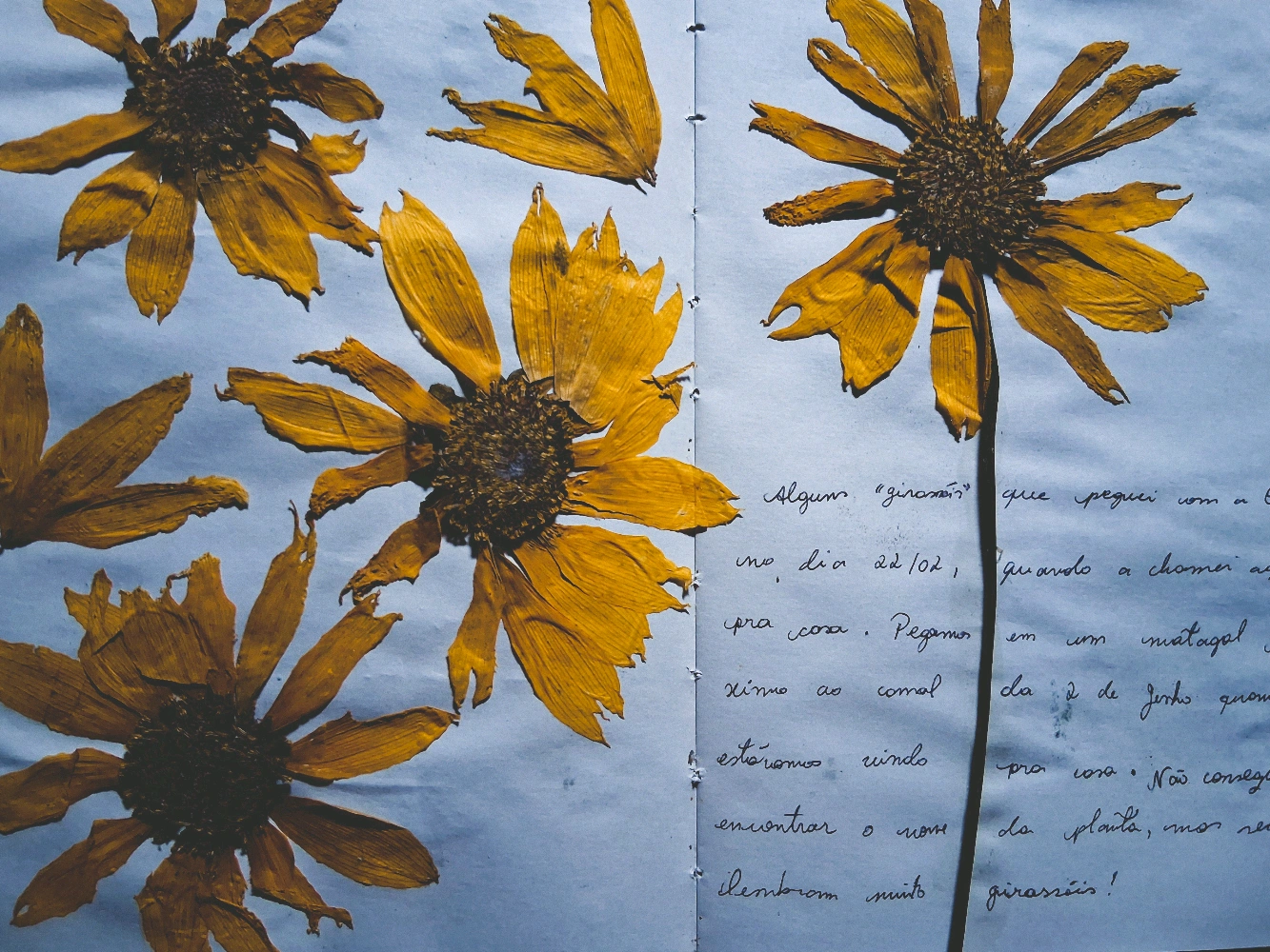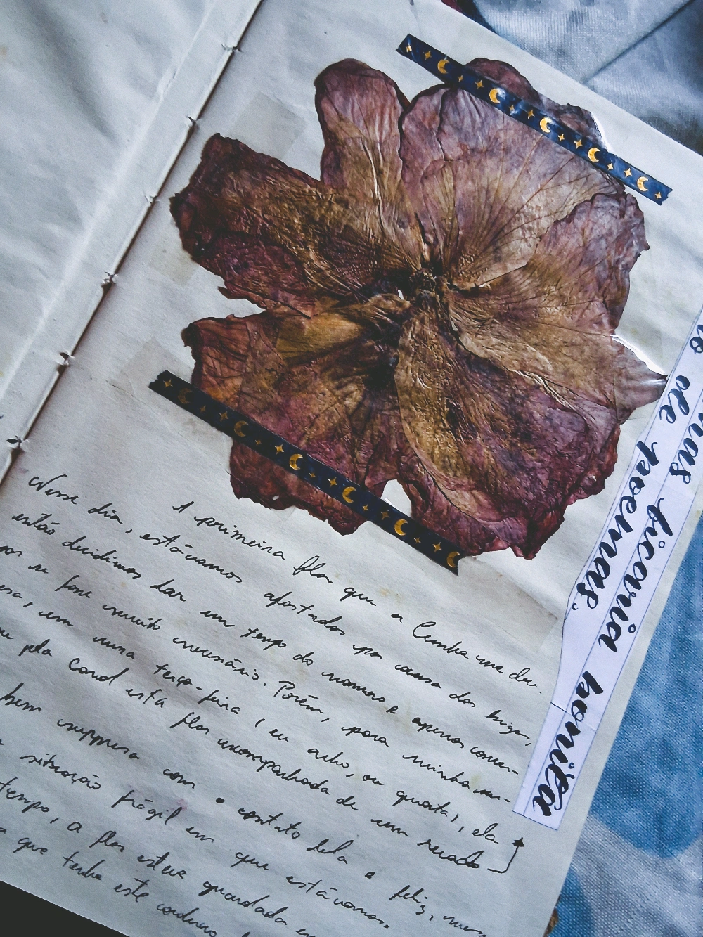 há alguns meses ganhei este caderno da minha namorada e decidi transformá-lo num "diário de fada", em que eu coleciono flores, folhas, plantas, etc, e escrevo brevemente sobre a espécie e o dia em que as coletei/ganhei!! antes de ter esse caderno, eu as prensava em um livro de poemas, mas depois não sabia o que fazer com elas prensadas, então eu as transformava em adesivos pra usar nos presentes e cartinhas, mas acabou que muitas mofaram ou não serviram bem como adesivos e ficaram esquecidas... (/。\) então decidi que este caderno seria meu herbário e agora eu estou aprendendo a prensar bem as flores pra que fiquem como um lindo registro botânico!! 💐