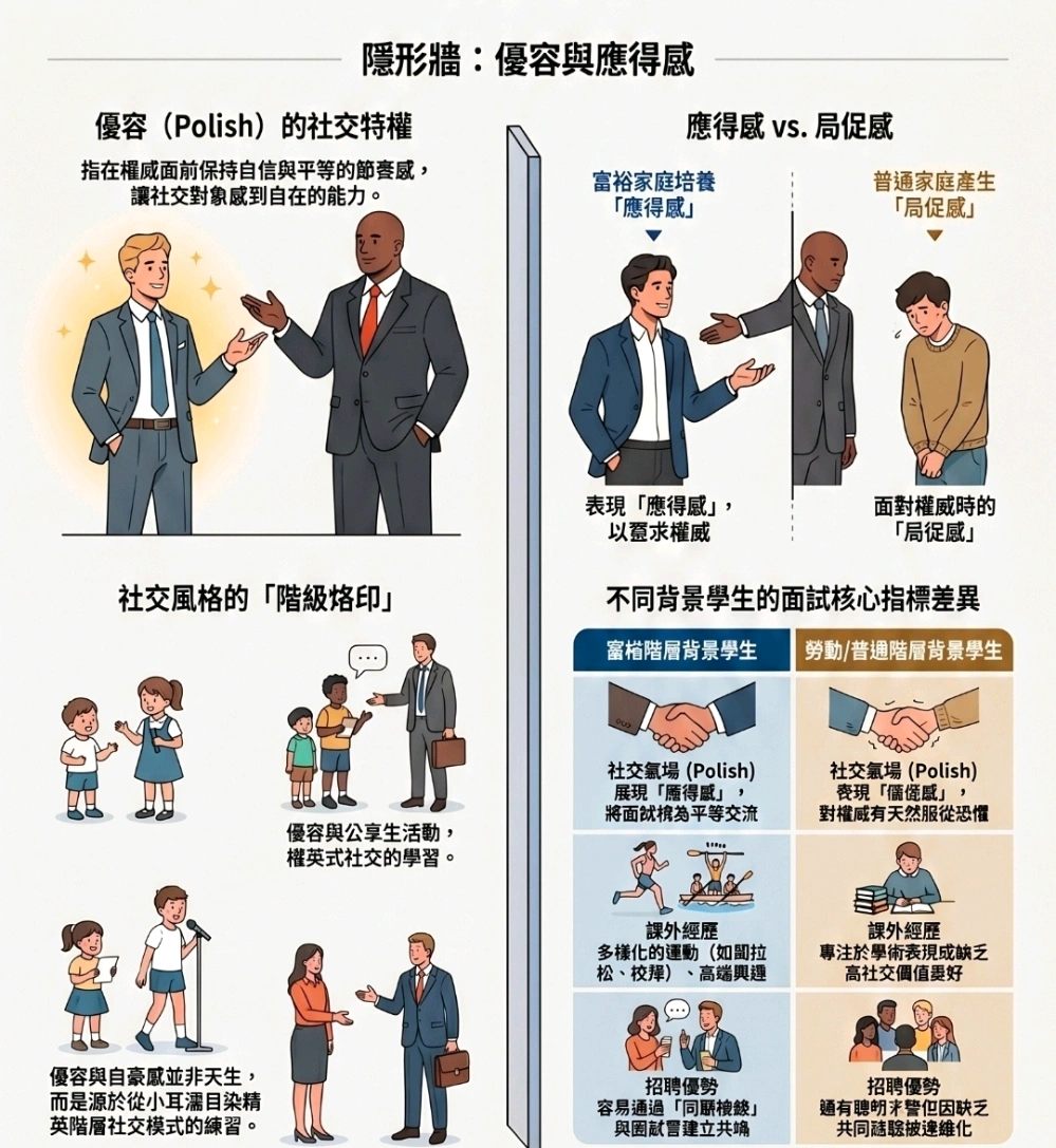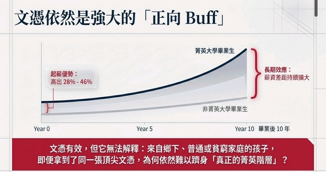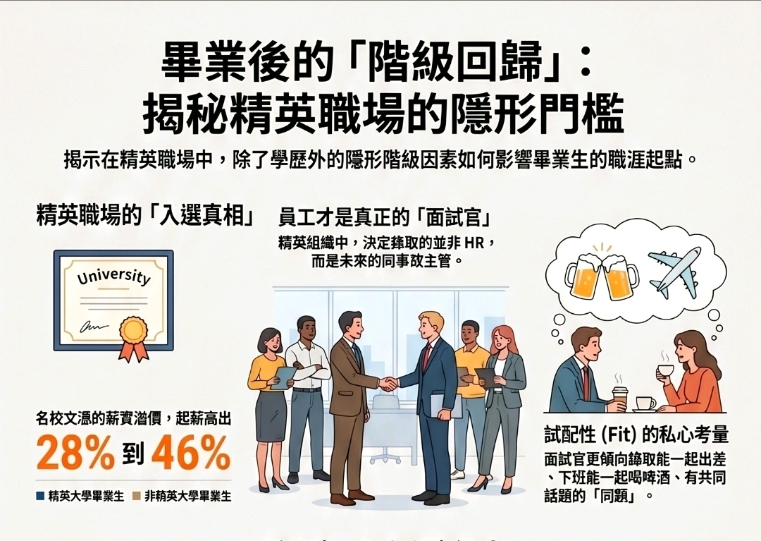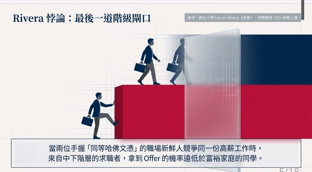 最近常常回頭去看把Ytr 壽司坦丁的影片,昨日無意間在做家事時,YT推播我看到這部:「畢業後,回到自己的階層:階級、自我、與(菁英)職場」 https://youtu.be/zNTVSsFJROQ?si=Cs1y7cJB5CaI0S33 邊聽完,邊回顧自己求學以及進入職場後的經驗,不禁佩服這部影片的完整性。 影片主要介紹某個學者的一項研究,這研究主要探討為何即便擁有頂尖名校文憑,來自不同階級背景的畢業生在進入菁英職場時仍存在顯著差異。 研究的重點大致如下: 1、名校文憑只是「正向 Buff」,不是萬靈丹: 很多人以為擠進精英大學就能抹平「出生樂透」的不平等,但研究發現,就算你跟同學同樣握著哈佛證書,如果你來自中下階層,拿到高薪 Offer 的機率還是遠低於那些富家子弟。這份學歷雖然給了你競爭門票,但它沒辦法自動消除你背景帶來的差距。 2、面試就像在滑 Tinder,看的是「心情」: 你以為面試官是很專業的 HR 嗎?錯了!在法律、投行這些金磚服務業,決定你生死的是那些每天工作 80 小時、累得半死的律師或顧問。對他們來說,面試更像是找「可以一起喝酒、困在機場也不無聊」的朋友。這種充滿私人情緒的「試配(Fit)」標準,對那些沒有共同社交話題的人來說,簡直是災難。 3、「優容(Polish)」是種特權,不是人格特質: 精英公司最看重求職者有沒有一種叫「優容」或「氣場」的東西。這指的是你在權威面前能從容不迫、甚至反客為主地主導對話節奏。但這哪是天生的?這是在富裕環境中日積月累「模仿」出來的身心技能。如果你總是很敏銳地在乎別人的感受,你反而很難展現出這種帶點「冷漠」的自在感。 4、「應得感」與「局促感」的童年詛咒: 富小孩從小被教導要表達感受、要求權威配合自己,養成了「我本來就應得」的自信。相反地,窮小孩因為物質限制,從小學會的是「局促感」——觀察別人的臉色、服從權威以求生存。當這種局促感被帶進面試場,面試官只會覺得你「很戳」,卻不知道這是你生存的本能。 5、自我風格才是精英職場的隱形守門員: 最終你會發現,這些公司其實是用「自我風格」來定義優秀,而不只是看你聰不聰明。富家子弟天生具備這種與階級掛鉤的「軟實力」,而那些試圖「逆流而上的鮭魚」,即便學業再努力,也會發現這道隱形的門檻,是僅靠功課好也難以跨越的。 其中的第3、4點更是寫得很精闢,如果仔細去回顧自己的人生經驗,尤其是在求學階段,有些同學總是一副很輕鬆自在寫意的神情。 平時我們為著考卷上的分數生悶氣,同樣考差的他,卻不怎麼在乎,過著自己的生活,學測儘管分數比他略高,卻還在焦慮未來的我們,他也總是瀟灑的看待這一切。 那種影片中說的「優容」感,是很難模仿跟學來的,階級有時會世襲,如同《魯冰花》中的經典台詞「老師,有錢人小孩子,什麼都比較會。」 但,有時候如果一直往這種死胡同去想,其實也不健康,一味的仇富並不能改變自己,也只會讓自己的視野越來越狹小。 有了孩子後,也會思考要怎樣能夠帶給他們比較多的資源,與其要孩子贏在起跑點,不如父母自己多爭點氣,讓他們能少有點彎路。 還有很長的路要走呢。