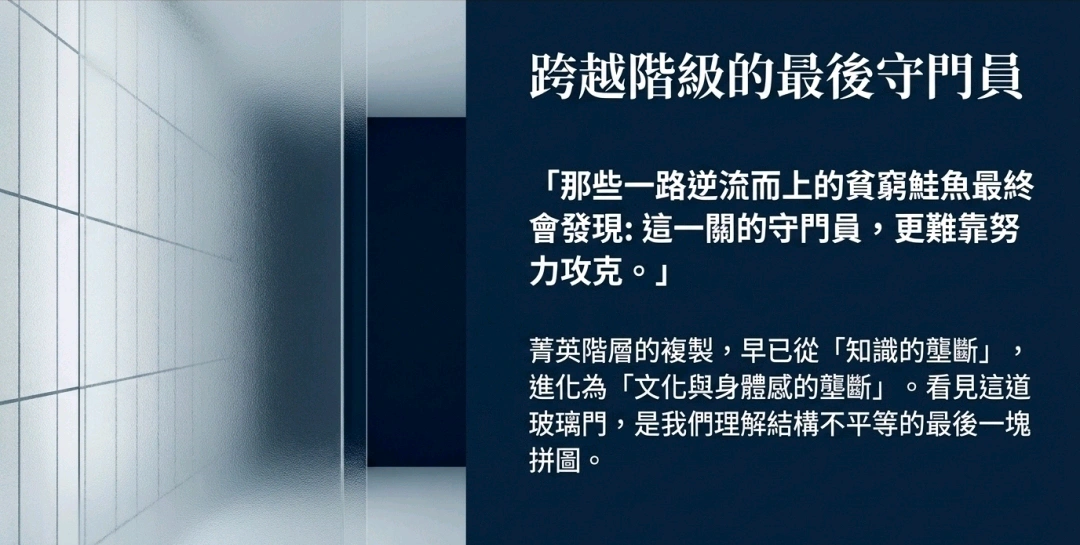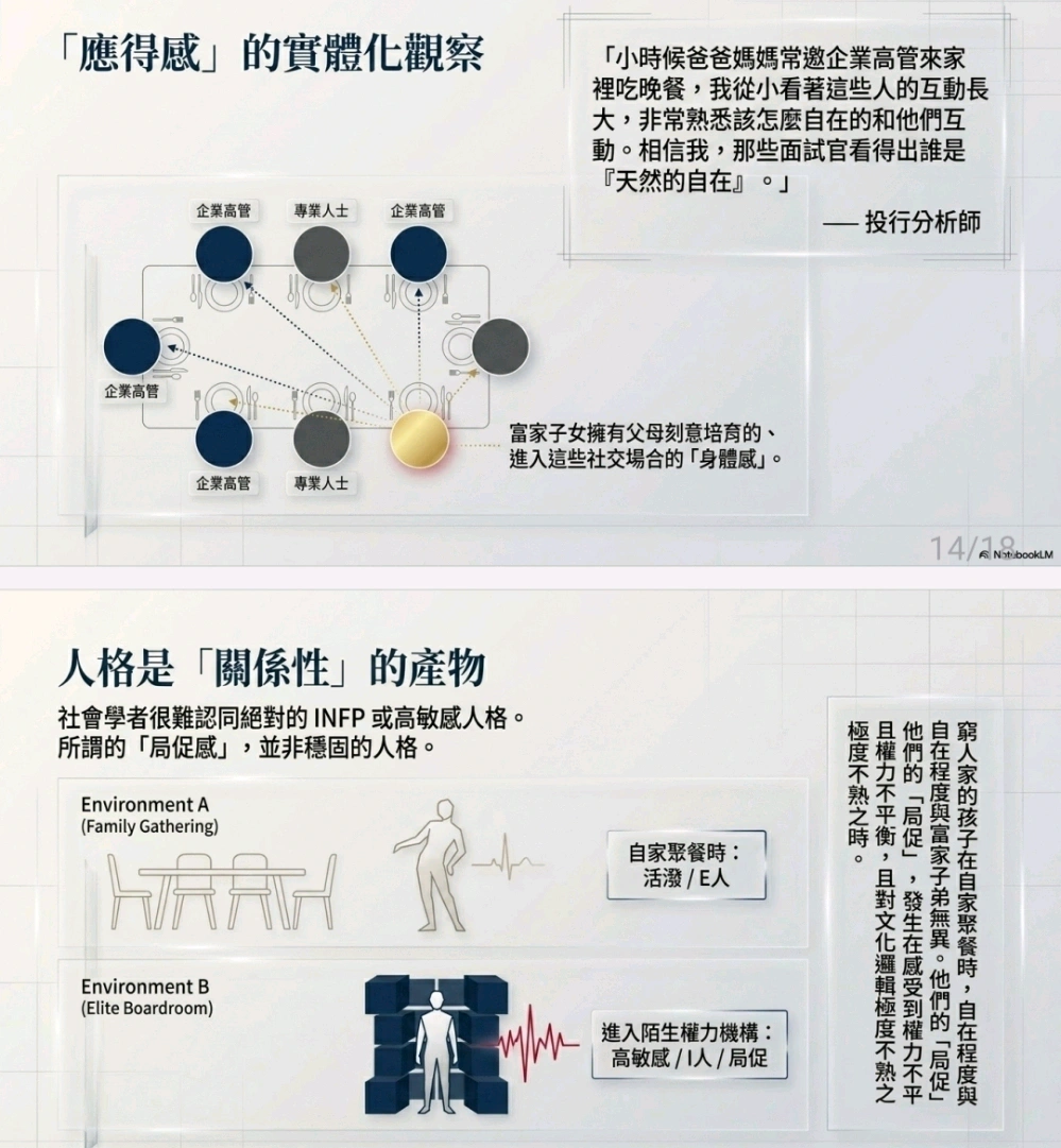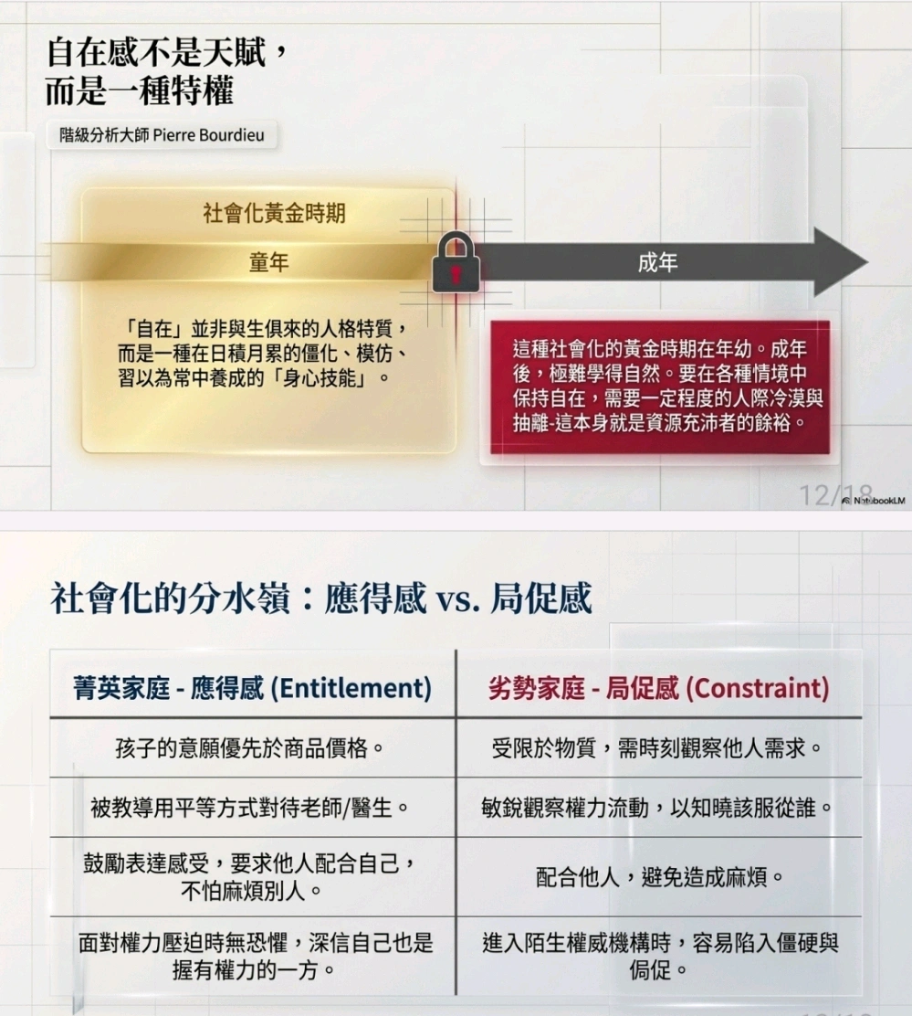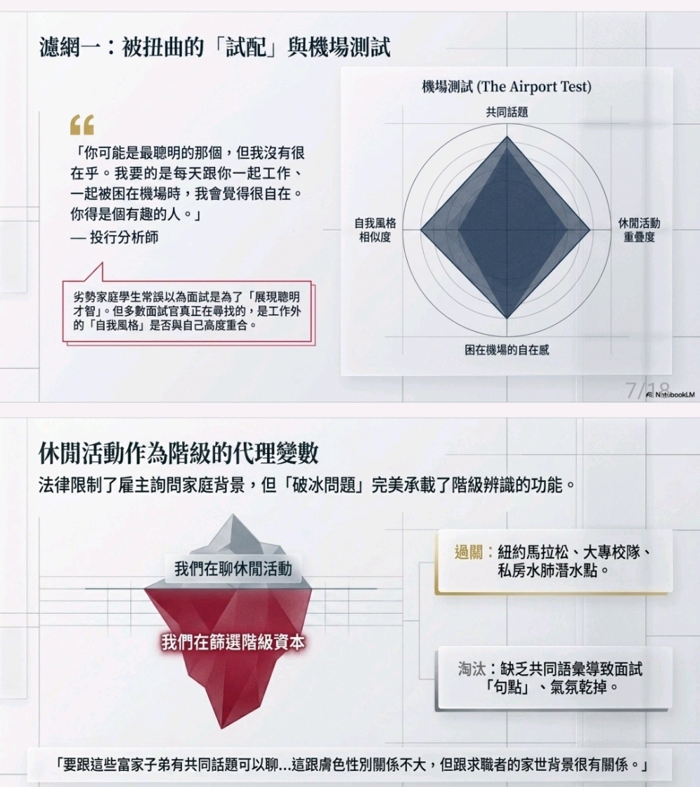 最近常常回頭去看把Ytr 壽司坦丁的影片,昨日無意間在做家事時,YT推播我看到這部:「畢業後,回到自己的階層:階級、自我、與(菁英)職場」 https://youtu.be/zNTVSsFJROQ?si=Cs1y7cJB5CaI0S33 邊聽完,邊回顧自己求學以及進入職場後的經驗,不禁佩服這部影片的完整性。 影片主要介紹某個學者的一項研究,這研究主要探討為何即便擁有頂尖名校文憑,來自不同階級背景的畢業生在進入菁英職場時仍存在顯著差異。 研究的重點大致如下: 1、名校文憑只是「正向 Buff」,不是萬靈丹: 很多人以為擠進精英大學就能抹平「出生樂透」的不平等,但研究發現,就算你跟同學同樣握著哈佛證書,如果你來自中下階層,拿到高薪 Offer 的機率還是遠低於那些富家子弟。這份學歷雖然給了你競爭門票,但它沒辦法自動消除你背景帶來的差距。 2、面試就像在滑 Tinder,看的是「心情」: 你以為面試官是很專業的 HR 嗎?錯了!在法律、投行這些金磚服務業,決定你生死的是那些每天工作 80 小時、累得半死的律師或顧問。對他們來說,面試更像是找「可以一起喝酒、困在機場也不無聊」的朋友。這種充滿私人情緒的「試配(Fit)」標準,對那些沒有共同社交話題的人來說,簡直是災難。 3、「優容(Polish)」是種特權,不是人格特質: 精英公司最看重求職者有沒有一種叫「優容」或「氣場」的東西。這指的是你在權威面前能從容不迫、甚至反客為主地主導對話節奏。但這哪是天生的?這是在富裕環境中日積月累「模仿」出來的身心技能。如果你總是很敏銳地在乎別人的感受,你反而很難展現出這種帶點「冷漠」的自在感。 4、「應得感」與「局促感」的童年詛咒: 富小孩從小被教導要表達感受、要求權威配合自己,養成了「我本來就應得」的自信。相反地,窮小孩因為物質限制,從小學會的是「局促感」——觀察別人的臉色、服從權威以求生存。當這種局促感被帶進面試場,面試官只會覺得你「很戳」,卻不知道這是你生存的本能。 5、自我風格才是精英職場的隱形守門員: 最終你會發現,這些公司其實是用「自我風格」來定義優秀,而不只是看你聰不聰明。富家子弟天生具備這種與階級掛鉤的「軟實力」,而那些試圖「逆流而上的鮭魚」,即便學業再努力,也會發現這道隱形的門檻,是僅靠功課好也難以跨越的。 其中的第3、4點更是寫得很精闢,如果仔細去回顧自己的人生經驗,尤其是在求學階段,有些同學總是一副很輕鬆自在寫意的神情。 平時我們為著考卷上的分數生悶氣,同樣考差的他,卻不怎麼在乎,過著自己的生活,學測儘管分數比他略高,卻還在焦慮未來的我們,他也總是瀟灑的看待這一切。 那種影片中說的「優容」感,是很難模仿跟學來的,階級有時會世襲,如同《魯冰花》中的經典台詞「老師,有錢人小孩子,什麼都比較會。」 但,有時候如果一直往這種死胡同去想,其實也不健康,一味的仇富並不能改變自己,也只會讓自己的視野越來越狹小。 有了孩子後,也會思考要怎樣能夠帶給他們比較多的資源,與其要孩子贏在起跑點,不如父母自己多爭點氣,讓他們能少有點彎路。 還有很長的路要走呢。