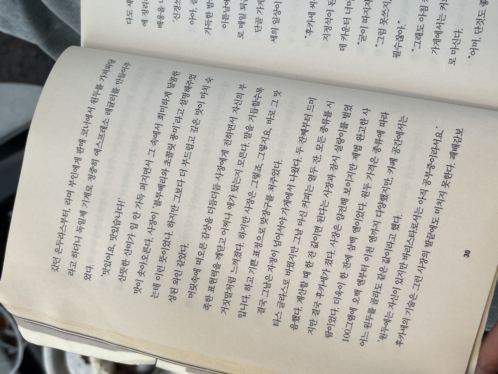 같은 원두에 같은 기계라도 후카세가 나서면 맛있단 말이야.' 익숙하지 않은 칭찬은 거북하지만 이것만큼은 예외였다. 콧노래 를 흥얼거리며 커피를 내렸다. 이야기를 조금 더 나누었지만 다시 진로에 대해 언급하는 일은 없었다. 그때••···• 후카세는 핸들을 고쳐쥐었다. 갑갑하다 싶었더니 사원 증을 그대로 목에 걸고 있었다. 인쇄실에서 작업하다가 그리되었는 지 줄이 엉망으로 엉켜 있었다. 하지만 단순히 그 이유만은 아니라 는 것도 알고 있다. 나는 뭘 하고 있는 걸까? 겨우 파일 열 개를 시간 을 들여 배달하고, 인쇄기 마스터를 교체한다. 아무나 할 수 있는 일. 동정심으로 굴러가는 사회. 그때 나도 아사미에게 미래에 대한 꿈을 이야기했더라면 좋았을 텐데. 은행원이라는 직업에 아사미만큼 뜨거운 열정을 갖고 있지는 않았지만 남에게 털어놓으면 어렴풋한 인생 계획의 중심에 핵이 될 만한 것을 발견할 수 있었을지도 모른다. 적어도 면접 연습 정도는 되었을 것이다. 그랬다면 한 군데쯤 합격 연락을 받았을지도 모른다. 그랬을지 모른다, 그랬을지 모른다, 그랬을지 모른다. 이렇다 할 목표가 없는 나날이지만, 그 말만큼은 쓰지 않겠노라 다짐했는데, 머릿속에는 늘 이 일곱 글자가 똬리를 틀고 앉아 있다.