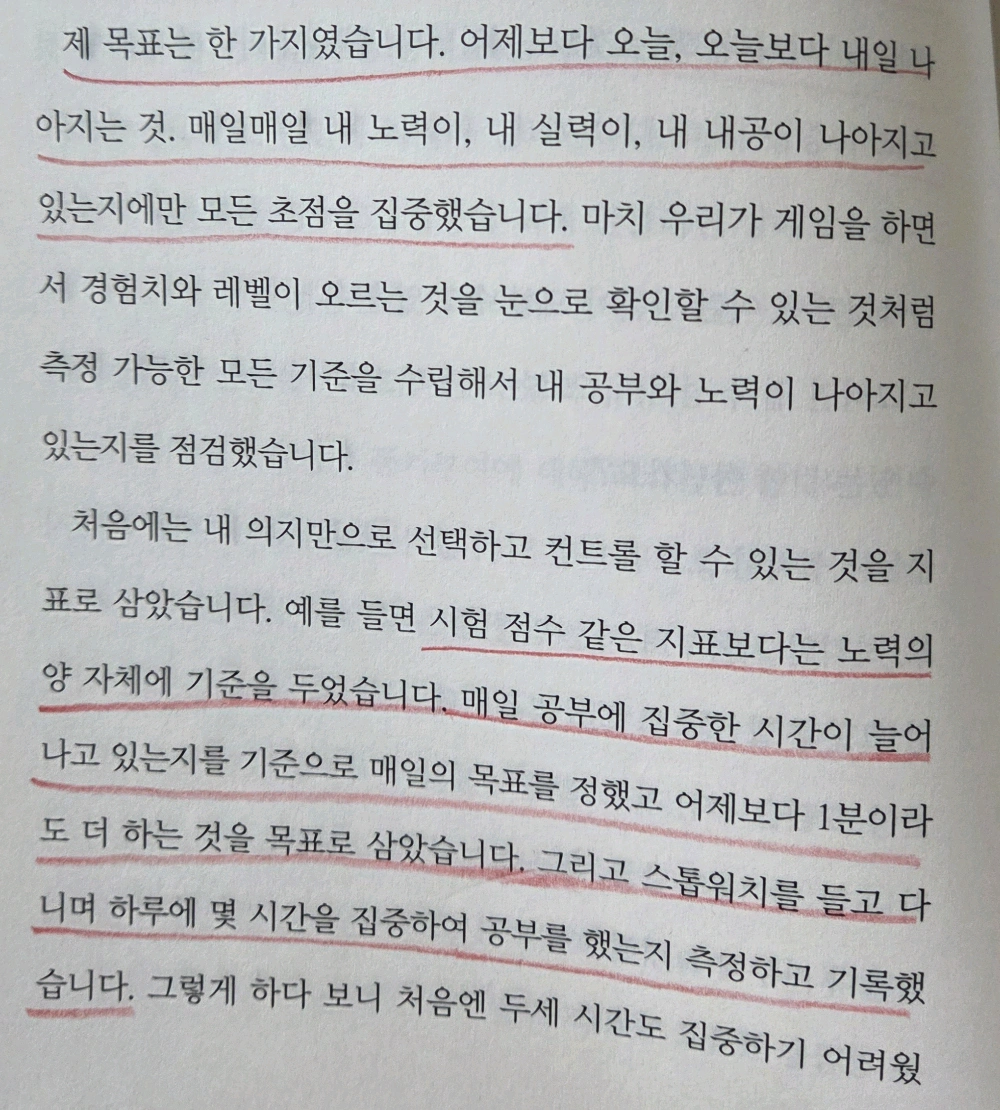 어제보다 오늘, 오늘보다 내일 나아지는 것. 매일매일 내 노력이, 내 실력이, 내 내공이 나아지고 있는지에 집중해라.