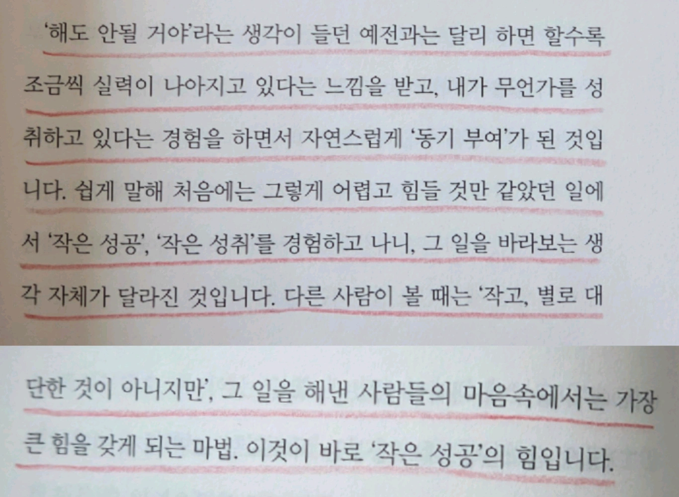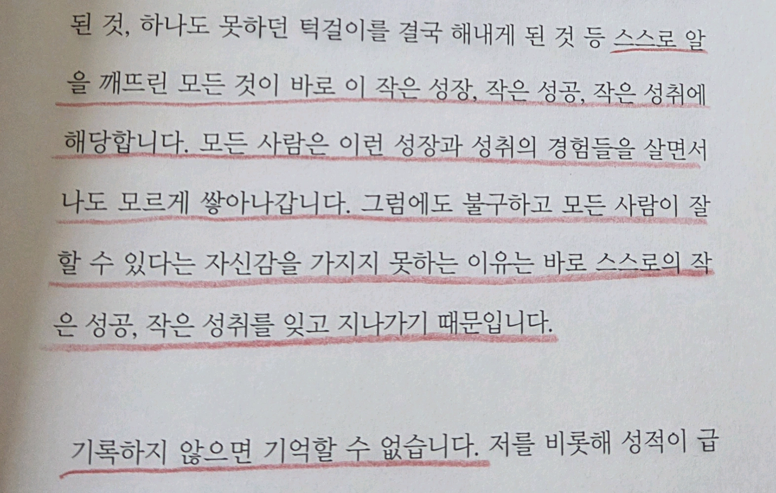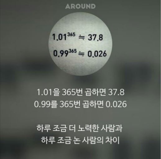 chapter 2. 나를 믿는 마음 #용기 p.76 <성장을 기록해야 하는 이유> 어제보다 너 나은 오늘 오늘보다 더 나은 내일을 보내자!!! 미적분 공부를 하다가 'e'를 배웠다. e=2.71828... 미적분쌤이 1.01의 365제곱은 37.8 0.99의 365제곱은 0.03이라고 옆반은 이게 급훈이라고 알려주셨다.ㅋㅋㅋ <하루는 1.00 ✦ ──────── ✧ 0.01 노력한 사람과 안 한 사람의 차이> 어떻게 이 기발한 발상을 생각했는지! 때로는 화려한 글자보다는 간단한 숫자가 더 도움될 때가 있는 것 같다.