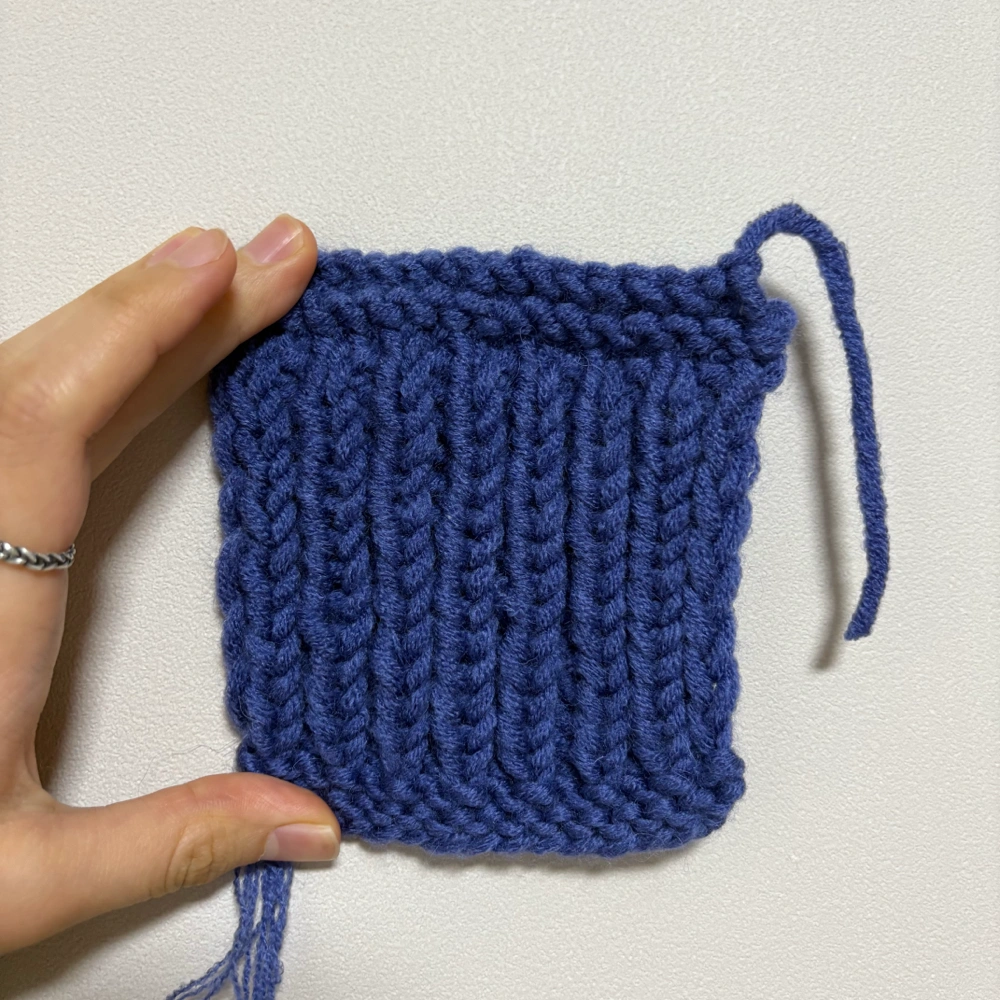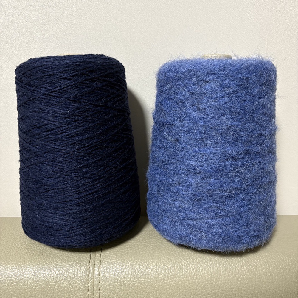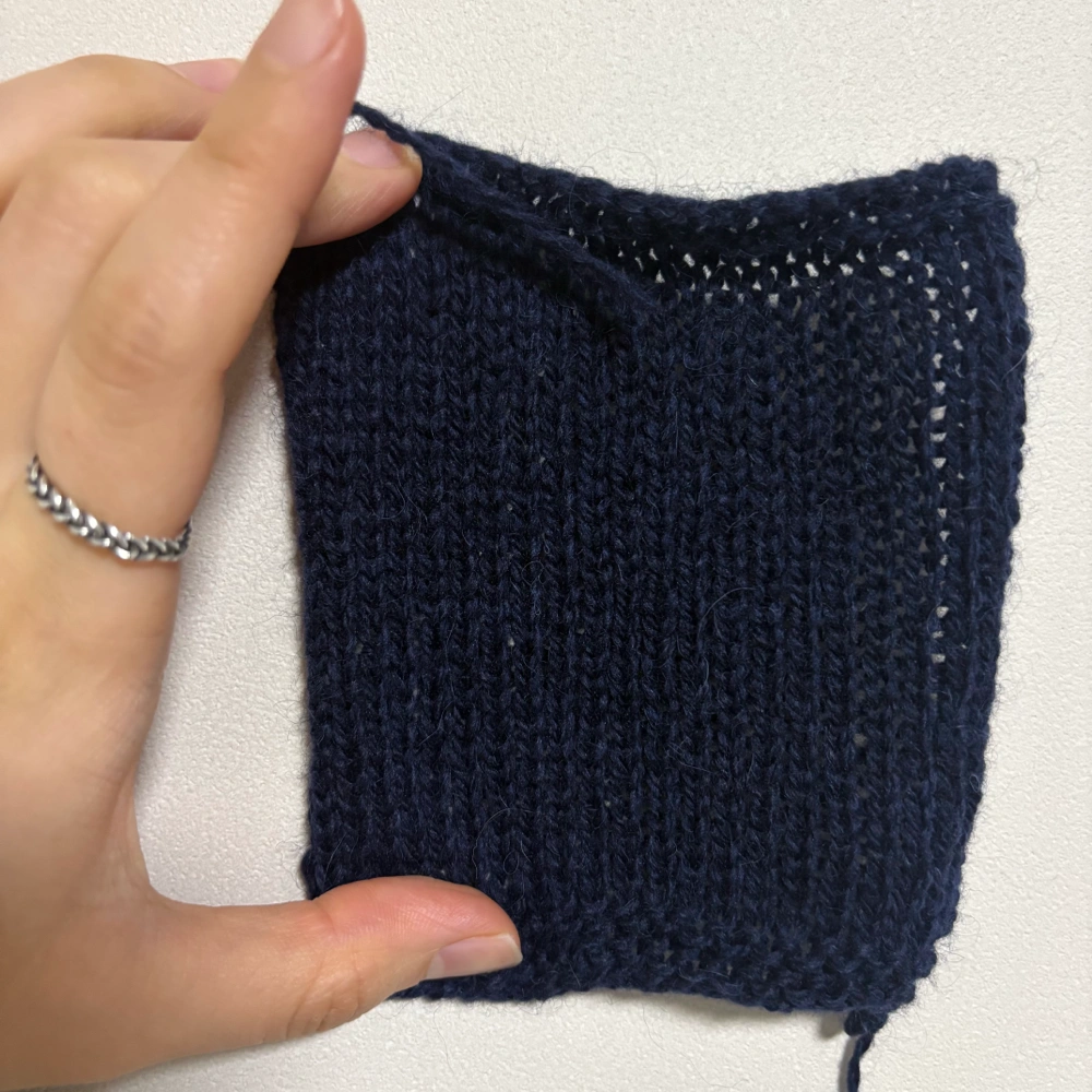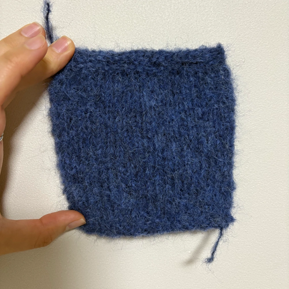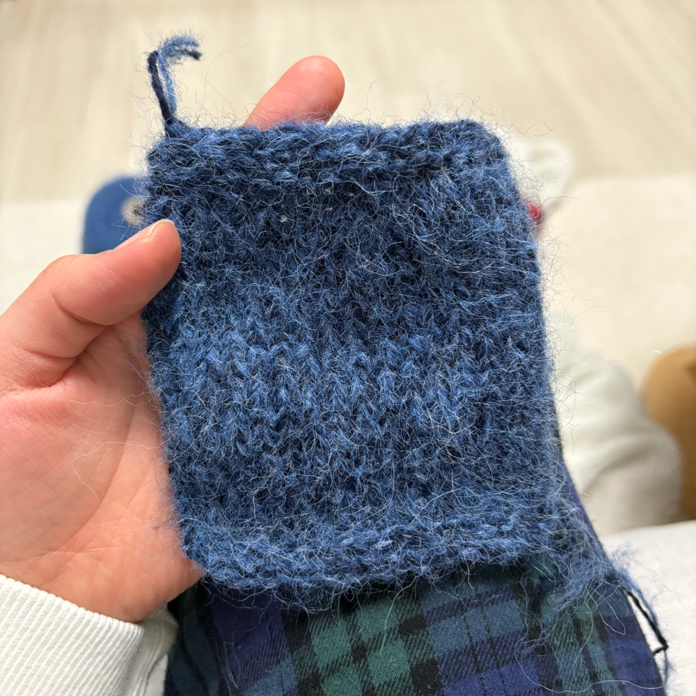 구매처: 데일리니팅얀(온라인 구매) 실: 시크릿(스모크 블루 멜란지)+샨티(나이트 솔리드) 합사 바늘: 4.5mm 코수: 18코 1) 세탁 전
