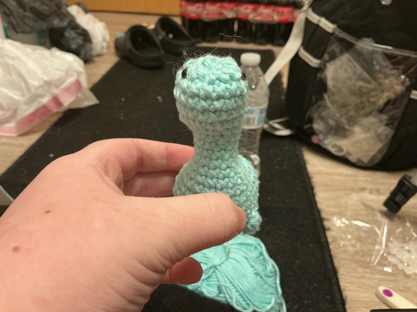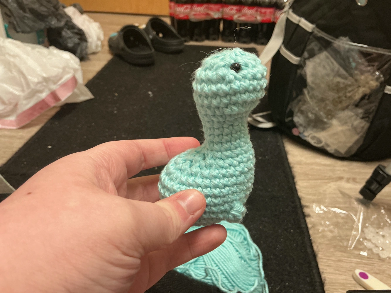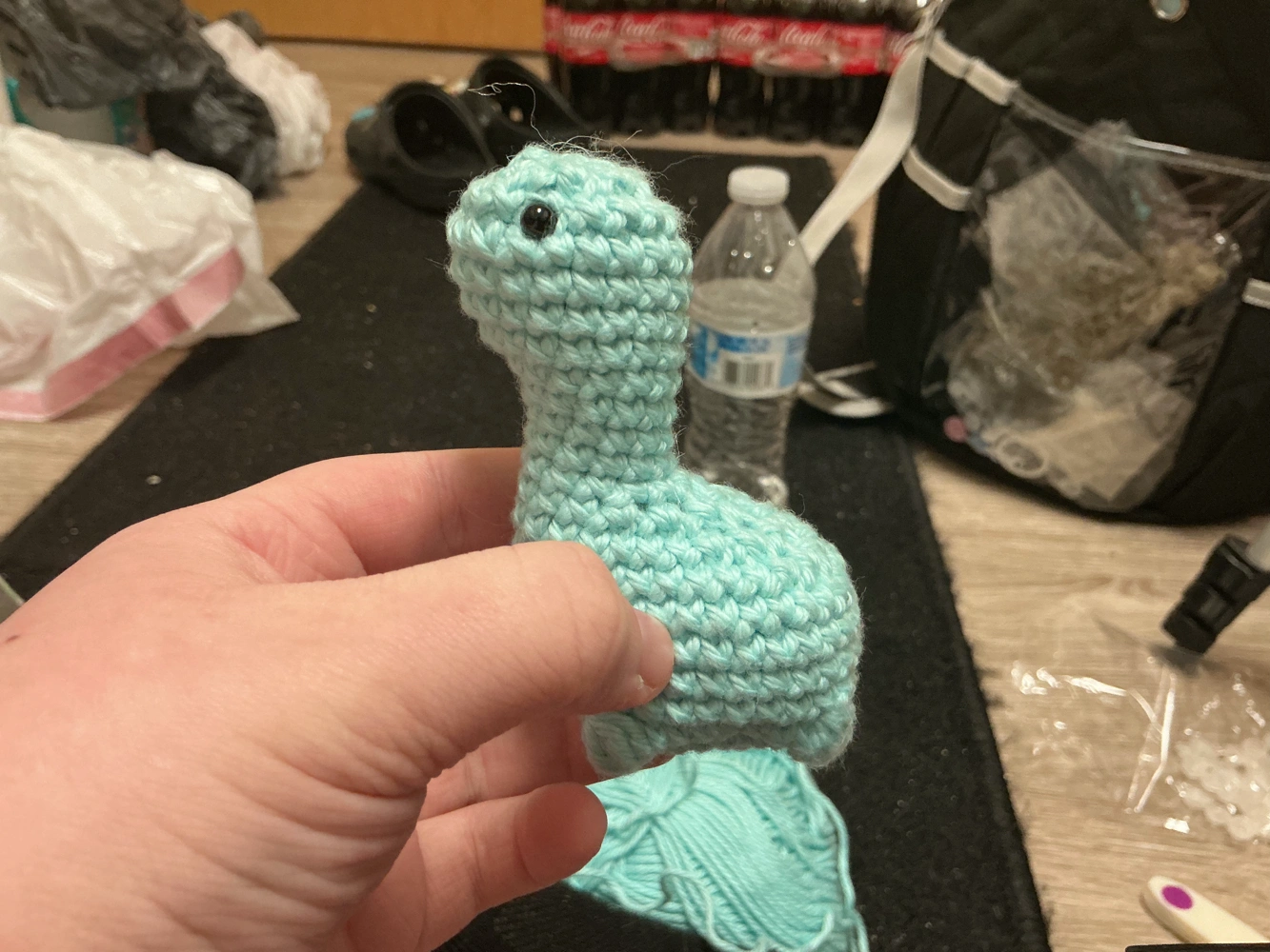 This turned out cute, the Dinoโs head is slightly turned which idm but I kinda wish it was straight. The pattern is easy to follow and itโs no sew! He looks a little goofy from the front but I think itโs funny lol might turn it into a keychain but idk weโll see. I tried to set him on the floor and he fell over lol so heโs a little top heavy.