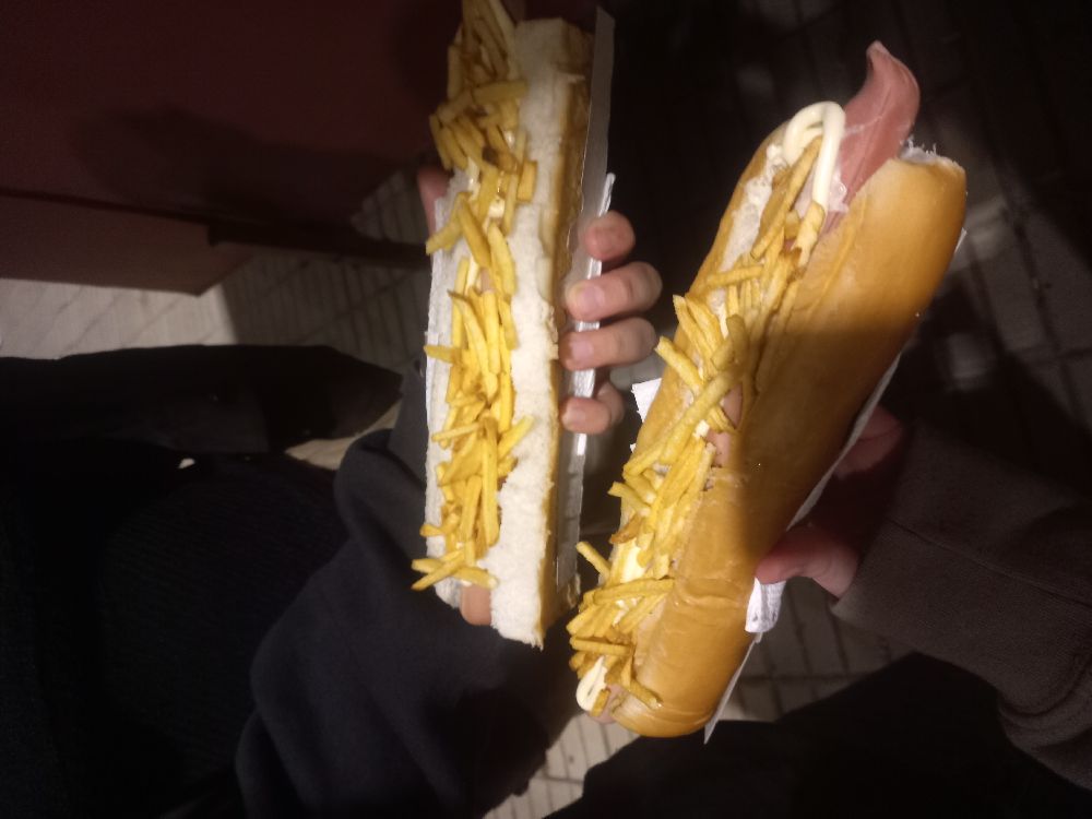 Pasó el tiempo en la noche y el orejón volvió a buscar a la amiga de mi amiga q ya se habia hecho mi amiga tambien. Justo cuando me senté a terminar el pancho (que ni siquiera se podia llamar pancho porque era un pedazo d pan) tranquila
