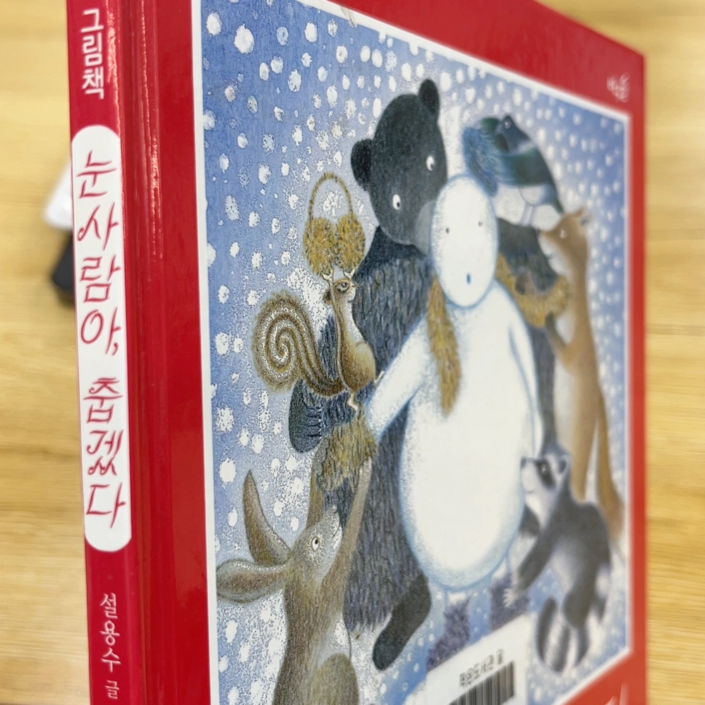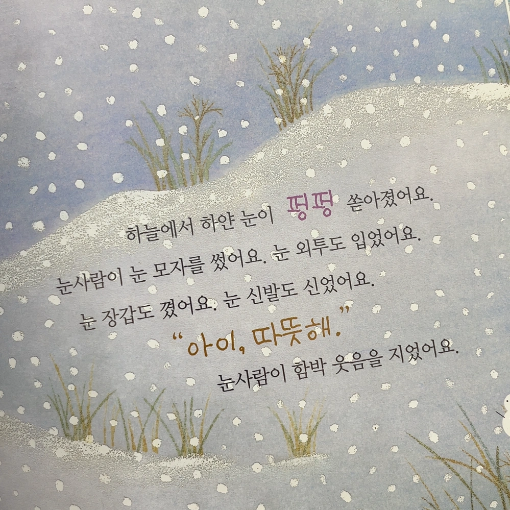 그림책 보기 너무너무 귀여운 발상 근데 근데 먹이 찾아 가는 동물들이 눈사람을 보고 자신의 털을 뽑아서 겨울 외투와 장갑 모자 목도리를 만들어주는데 애들 눈이 쪼금 무섭다 근데 ㅋㅋㅋㅋㅋ 너무 귀여워.. 더워해서 다시 회수해감 눈사람은 결국 눈이 제일 따뜻하다는 이야기 너무 귀여워요.. ☃️❄️🌨️🧣🧥🧤🧢