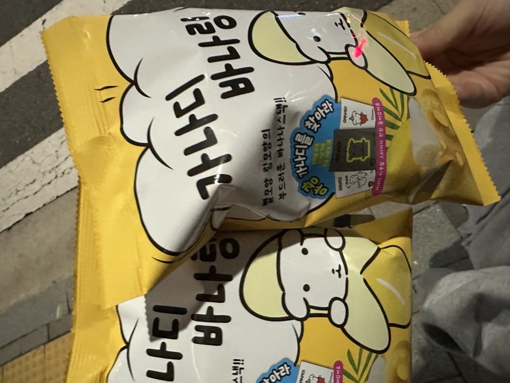 과자는 그냥 바나나 맛 초코 입힌 과자. 근데 띠부실이 너무 ㄱㅇㅇ💕 레어 나왔으면 좋겠는데 가나디는 다 귀여우니까 용서된다.