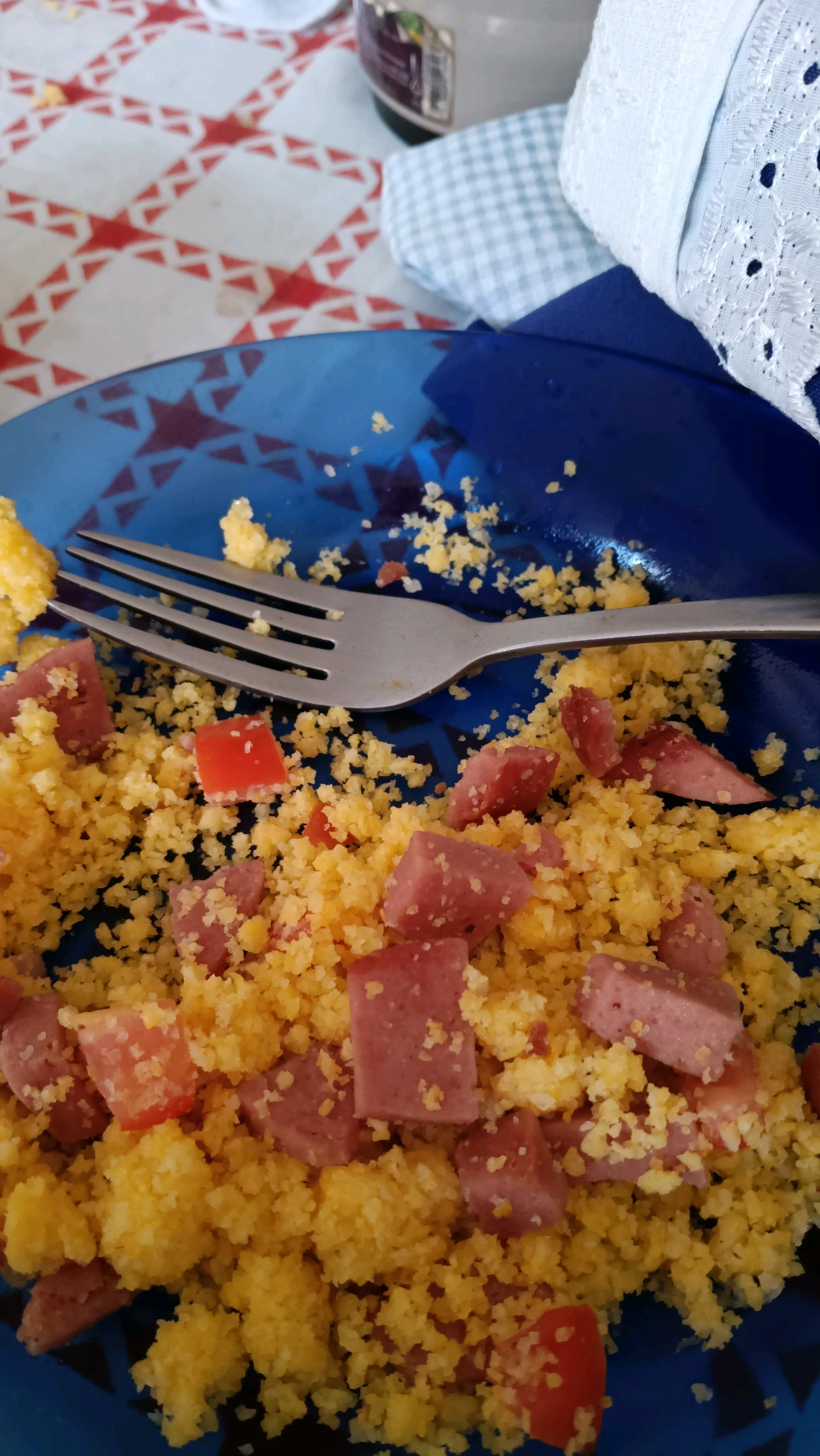 lanchei cuscuz com mortadela lá no trabalho e estava uma delícia 😋👍🏻