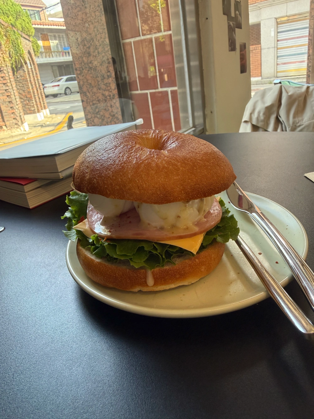 오늘도 그늘 출석🍀 주말에 여기서 책 읽으며 맛도리 먹는 게 소소한 행복이다. 이러려고 돈 벌지머☕️🥯🐷