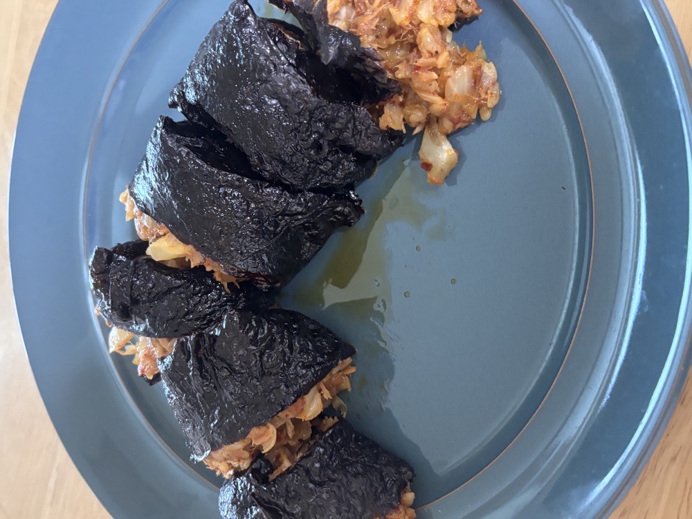 졸라끔찍한비주얼인 내가말은김밥 방치된 김밥김이 있길래 싸봤다. 김을 꺼낼 때부터 말랑스러운게 불길했어 회피성향으로 가볍게 넘긴뒤 말아 칼을 들어 토막내려 하는데 억센 풀처럼 잘리지 않았다 개빡쳐서 가위로 잘랐다 그리고 먹으니까 겁나 질겅질겅 충무김밥처럼 들고먹을 수 없엇다. 들면 한줄을 다 입에 넣어서 씹어야했다. 한 덩이 먹을 때도 김이 넘어갈 때까지 쿰척쿰척.. 숟가락에 올려놓고 밥알 빼먹고 마지막에 김먹음 다신 안싸