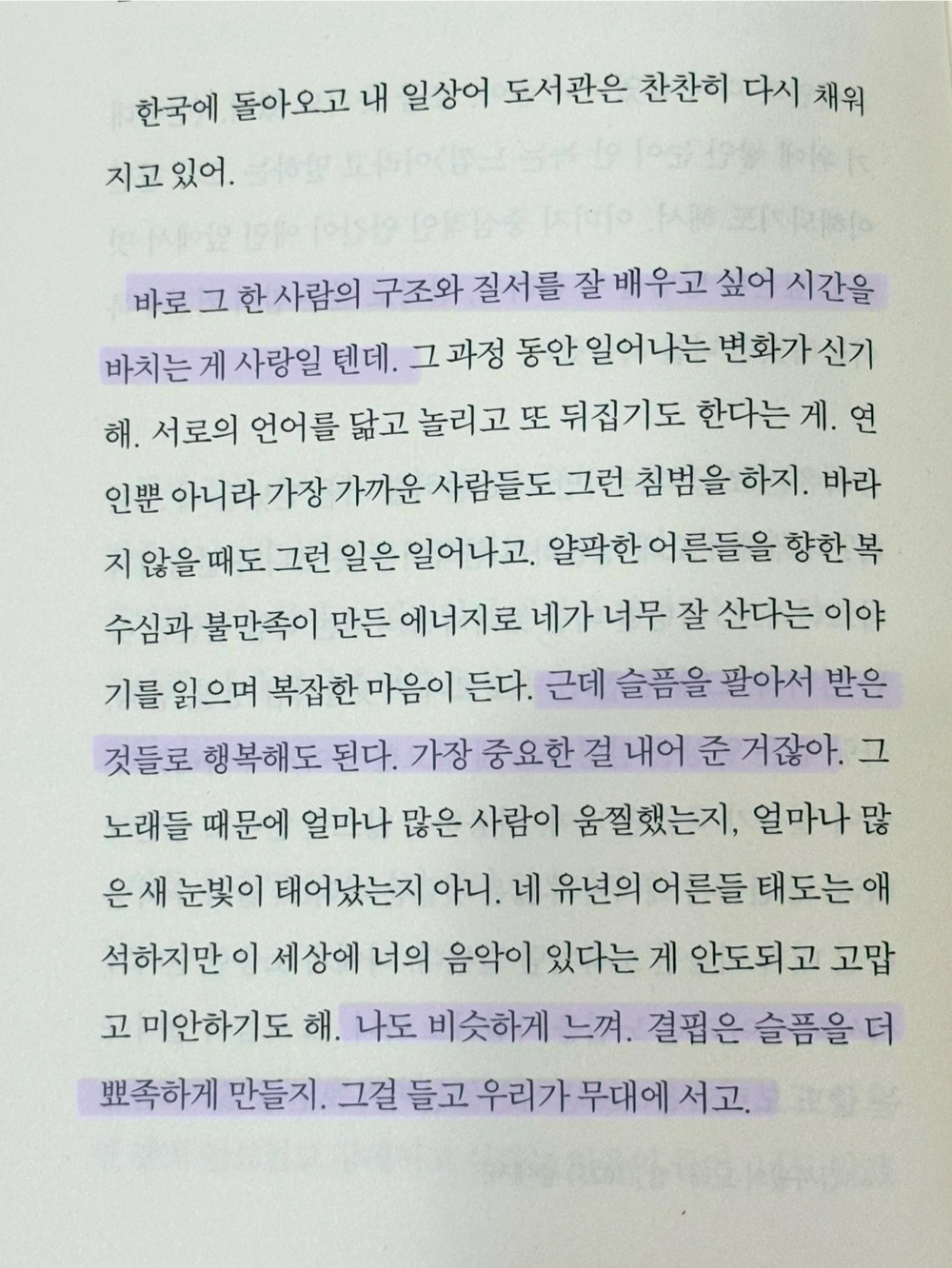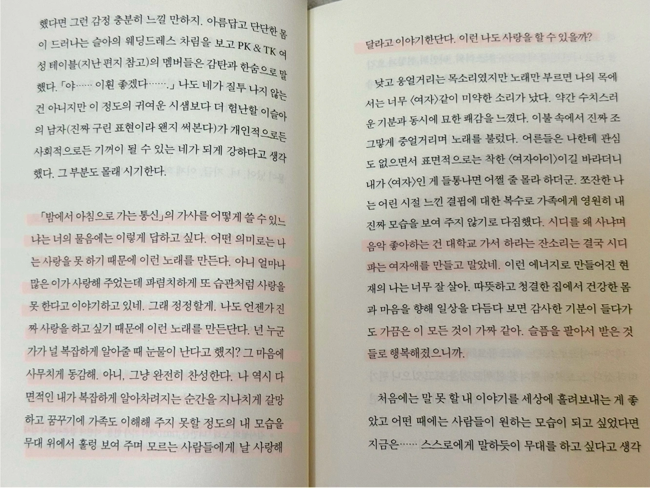 친구끼리 이런 편지를 주고받을 수 있다고????? 진짜 다른 세상 사람들 같다... 좋은 문장이 너무 많아 예술하는 사람들 특유의 딥함이 좋다. 가끔은 작가들의 작품보다도 대화가 나를 비일상으로 더 잘 데려다놓는 것 같기도 하고 “무대까지 올라가 버리는 사람은 그럴 수밖에 없는 이유가 있는 거겠지. 너도 나도 긴장하고 두렵다면서도 기어코 무대 위로 올라가는구나.“ / ”나도 비슷하게 느껴. 결핍은 슬픔을 더 뾰족하게 만들지. 그걸 들고 우리가 무대에 서고.“ 좋은 부분이 한두가지가 아닌데 이 부분도 되게 좋았다. 어떤 일은 하고 싶어서 하는 게 아니라 할 수밖에 없어서 하게 된다. 억지로 고통을 견디며 살아낼 때도 그런 감각을 느끼지만, 고통까지 안고 갈 만큼 마음 깊이 사랑하는 일을 생각할 때 그 감각은 훨씬 선명해진다.
