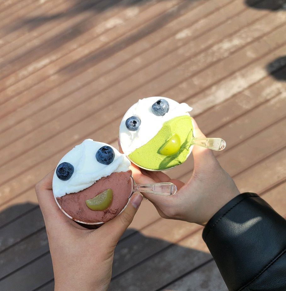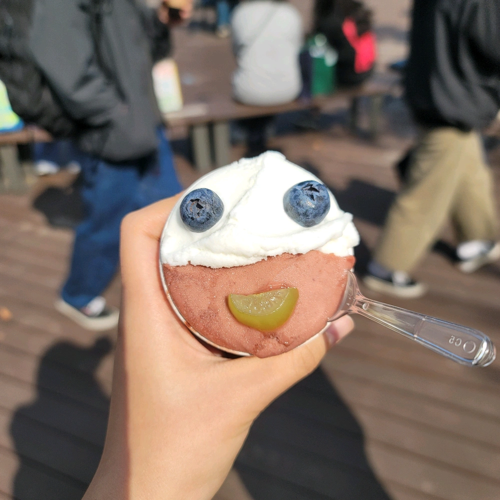 누볼라젤라또 가게가 팝업으로 와서 행사장에서 먹었슨♡ 소금우유 / 포도 / 말차맛으로 먹었는데 우유맛은 되게 고소하고, 포도맛은 정말 가짜포도맛이 아니라 진또베기 ㄹㅇ 포도맛이었음!! 샤인머스켓도 아니고 보라색달콤한 포도맛ㅠㅠ 너무 오랜만이라 반가워서 소리지르며 먹을지경이었음ㅋㅋㅋ 말차맛도 꾸덕하니 진해서 아주 맛있었음!! 과일토핑으로 얼굴 만들어준게 짱귀요미 포인트♡