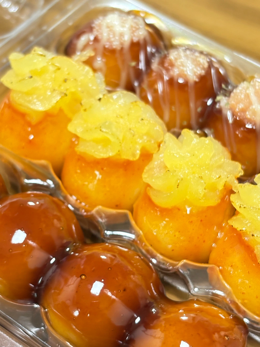 기본 당고는 짜지도 않고 그냥 보이는 그대로의 맛... 중간 거는 순한 불닭 소스로 만든 떡꼬치에 고구마 무스 올린 맛 명란마요? 올라간 당고가 제일 짜고 맛있었담 🍡🍡🍡