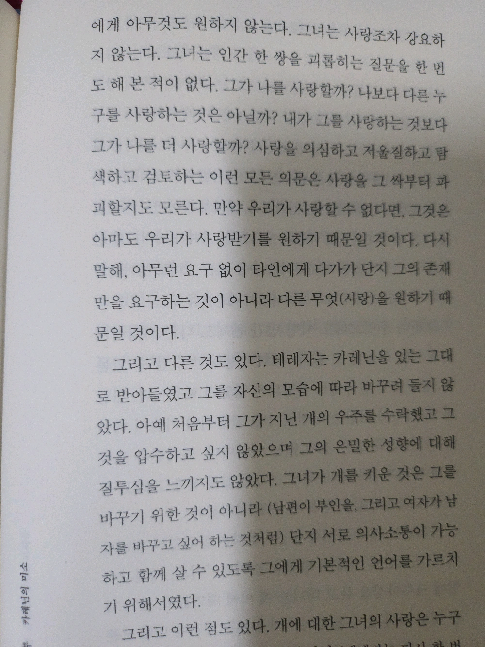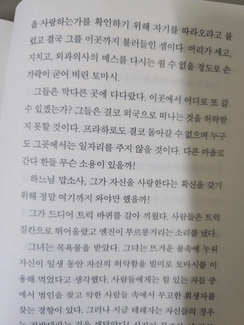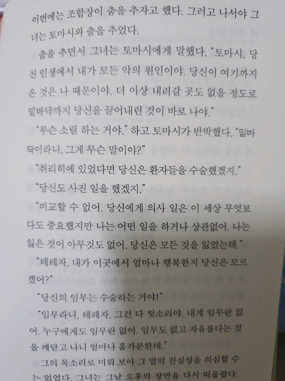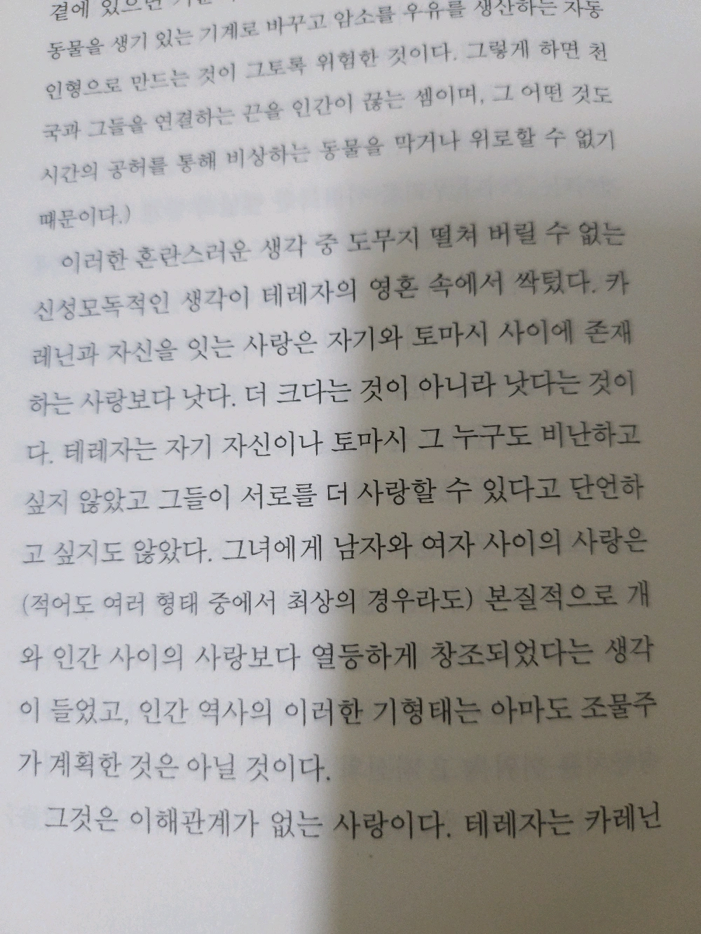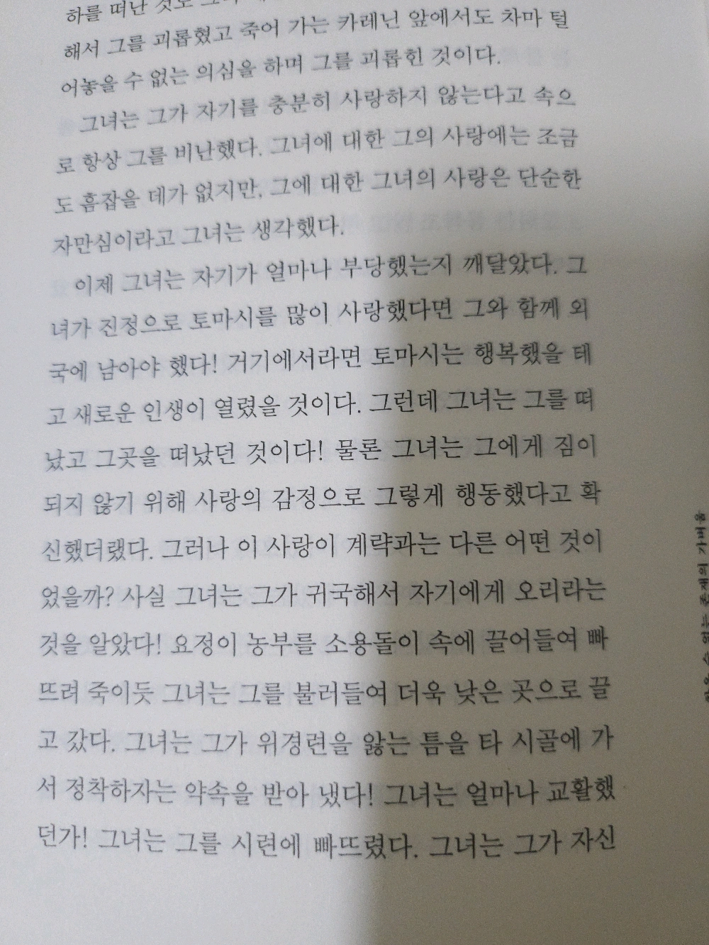 마지막 7부부터는 거의 오열하면서 읽음 수많은 책 속에서 고전 명작으로 살아남은 이유가 있구나,, 깊이가 남다르다 요즘 내가 하는 생각과, 너무너무 비슷한 상황이 겹친 부분이 있어서 읽기 힘든 부분도 있었음ㅠ 나=테레자ㅠ 조금 더 어릴 때 읽었다면 나도 지금과는 다른 사람이 되지 않았을까 싶지만 지금의 나이기에 뼈져리게, 진짜 사무치게 공감하지 않았나? 싶기도 하다 결말이 너무 조앗어요 결말 진짜 조앗어요 결말이 최고 조앗네요,,