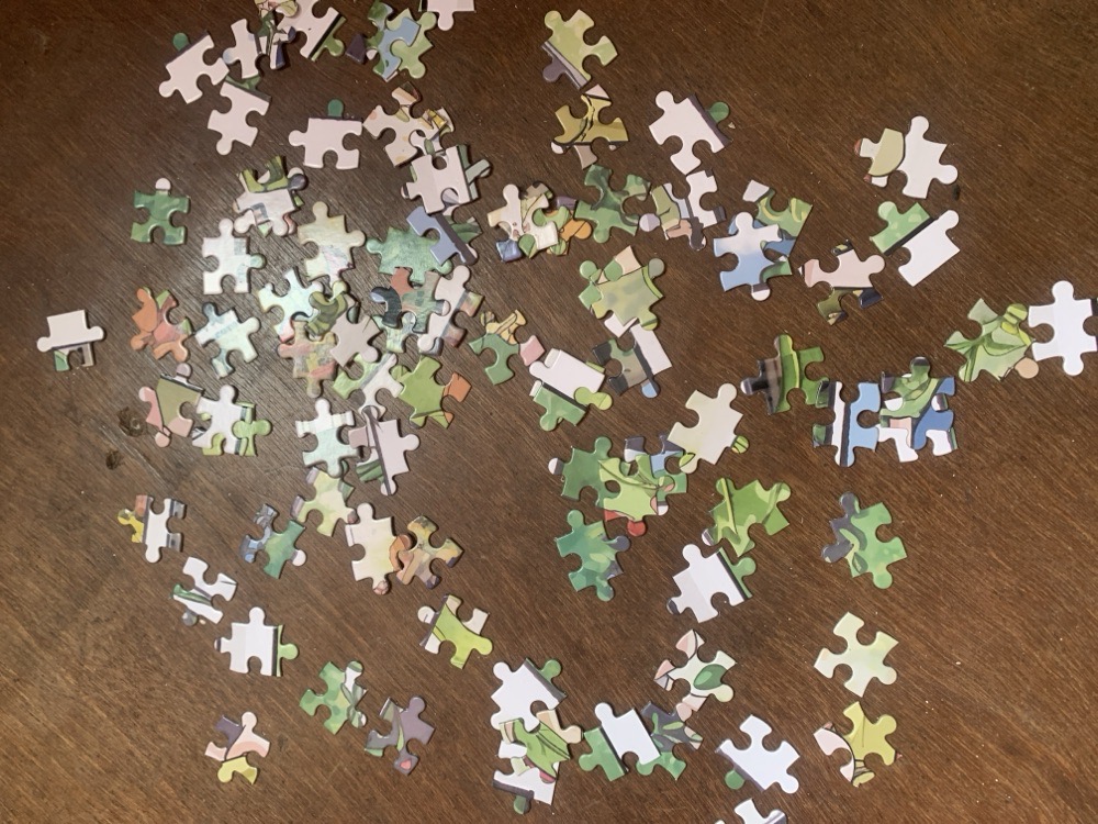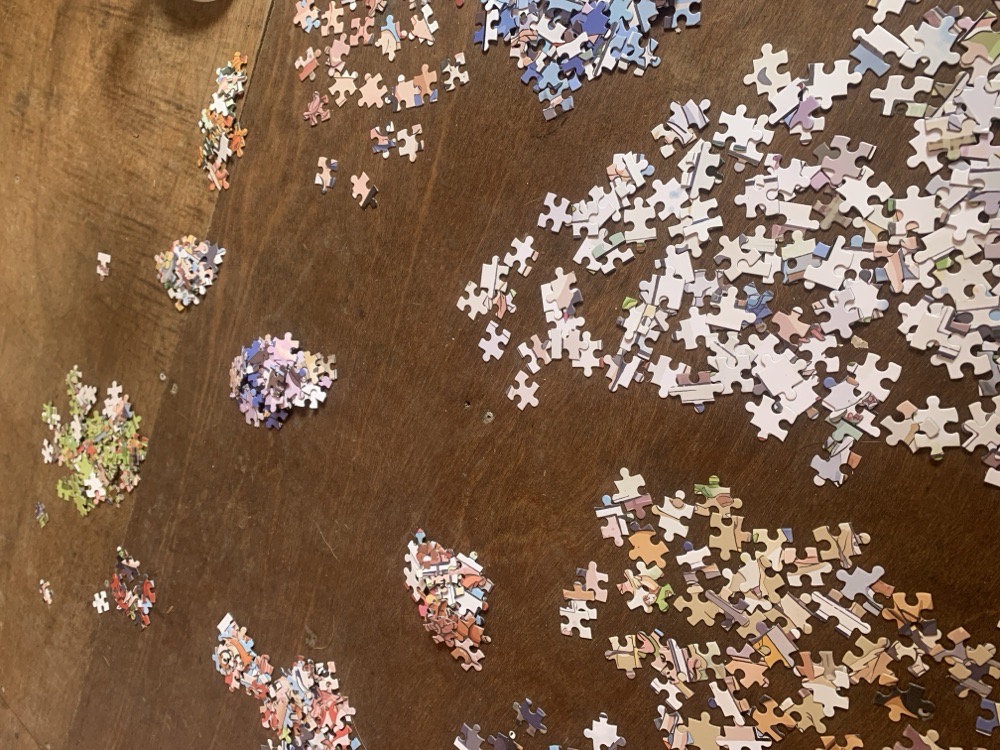 so i grouped these by color which makes it much easier for me to find the right one. this is my first time doing a 1000 pc puzzle so it will take some time. but hopefully i can reach at least 30% progress by the end of the day. good thing i dont have class for a whole wk! (and i specifically bought it for that purpose lol) question: to those who have done this before, what are your tips to make this faster?