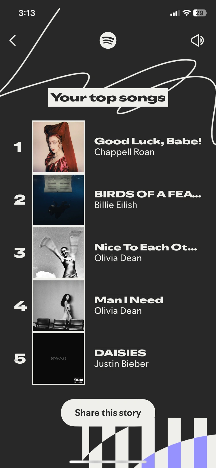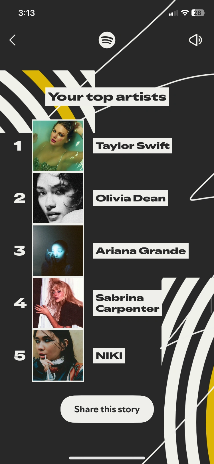 HELL NOOO my #1 shouldve been olivia dean😞im done with my swiftie era pls i beg of you. and also whaaaattt 49,000 minutes??????!!!!!! BRO thats like a WHOLE MONTH of listening to nothing but songs +++not including all the songs ive played on yt on repeat but anyhow, im happy to see that everyone is sharing their wrapped!! i forgot spotify releases wrapped at this time of the yr. looking forward to the nxt one 😋