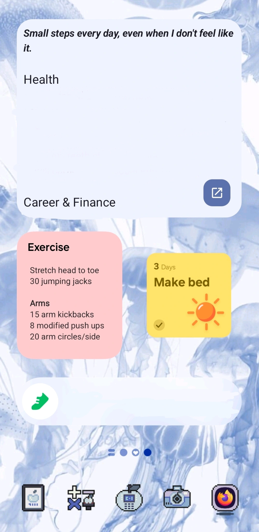 put a widget to see my screen time and to start a pomodoro timer. might change the pomodoro widget or delete Focus Friend. It's cute, but I have too many apps that have a focus/productivity timer feature. I still have to see which ones work the best for me. Also, does anyone have tips for actually working out? I like walking but it's difficult to get myself to exercise consistently.