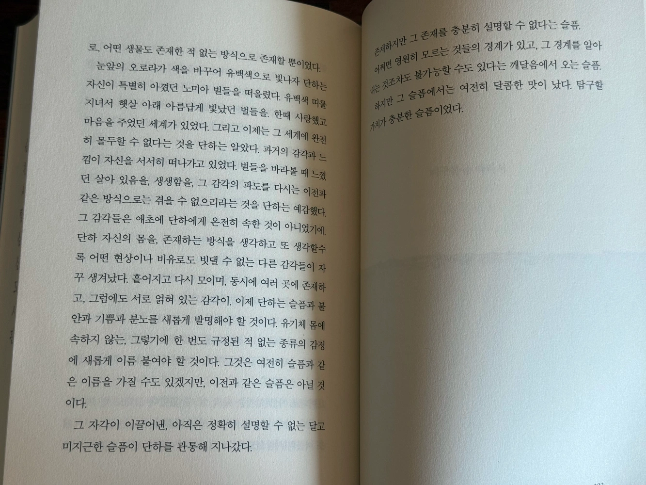 어쩌면 영원히 모르는 것들의 경계가 있고, 그 경계를 알아내는 것조차도 불가능할 수도 있다는 깨달음에서 오는 슬픔. 하지만 그 슬픔에서는 여전히 달콤한 맛이 났다. 탐구할 가치가 충분한 슬픔이었다.