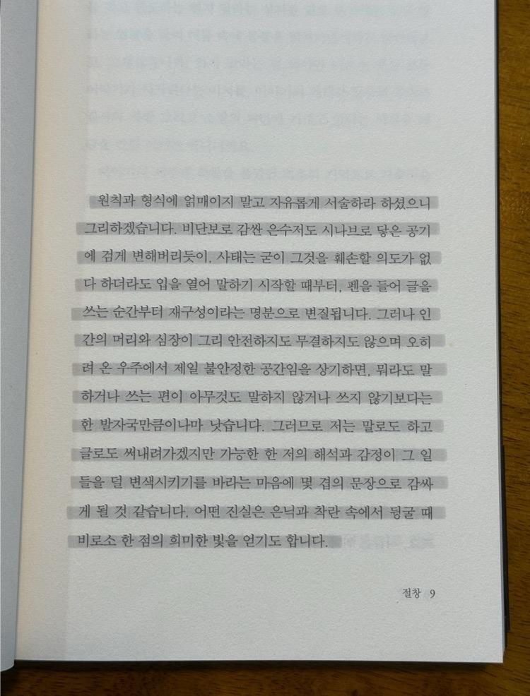 말하기에 필요한 것은 일차로 청자의 존재이고요. 말하기와 듣기, 쓰기와 읽기란 비록 그것으로 인해 변하는 실재가 없음은 물론 그것이 거쳐가는 길이 모순의 흙과 불화의 초목으로 닦이고 마침내 도달하는 자리에 결핍과 공허만 남아 영원한 교착상태를 이룬다 한들, 그 행위가 한때 존재했다는 사실만으로도 누군가의 영혼이 완전히 부서져버리지 않도록 거드는 법입니다. 언어의 본질과 역할을 두고 명멸하는 무수한 스펙트럼 가운데 그것만큼 괜찮은 구실이 또 있는지, 나는 아직 알지 못합니다.