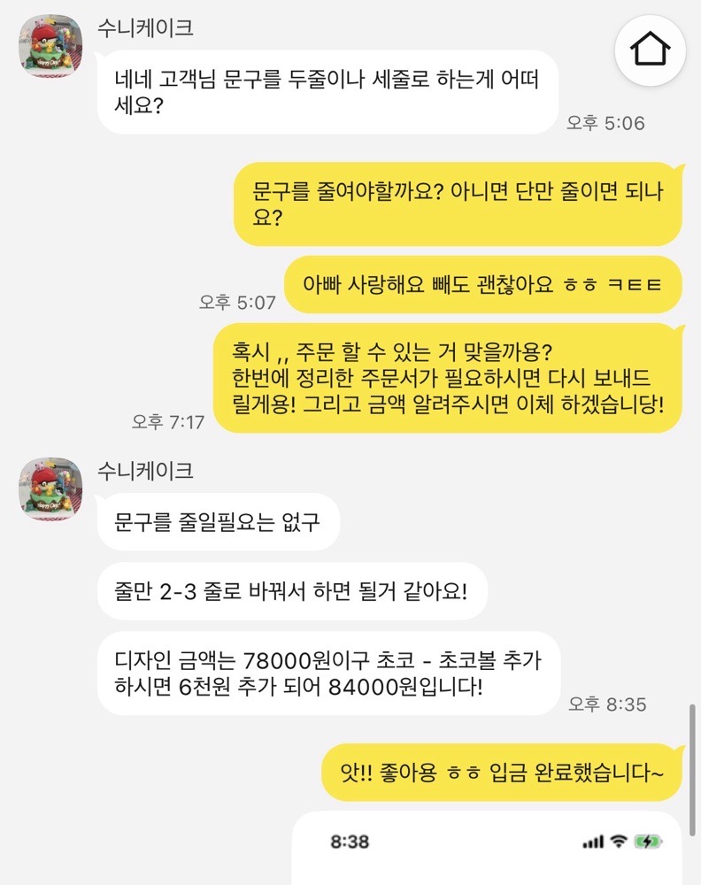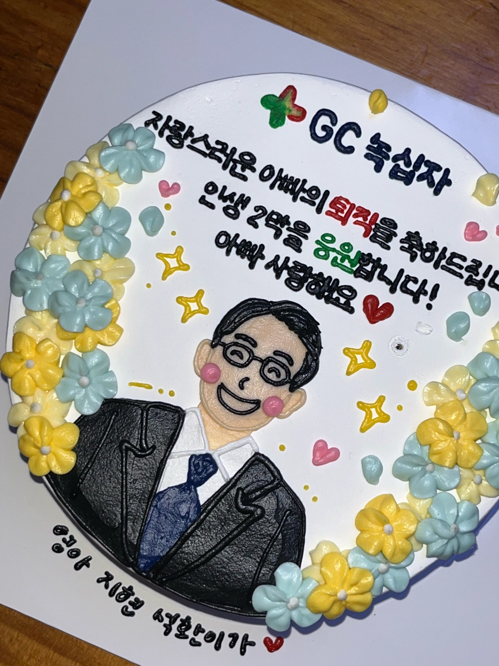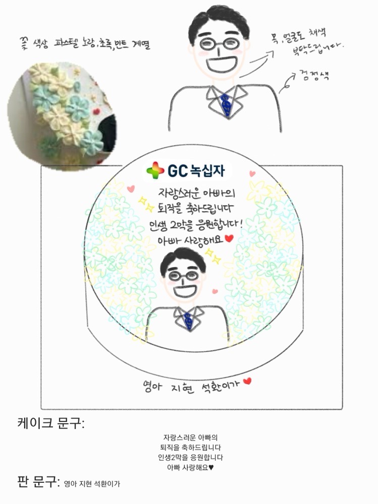 세상에 내가 살면서 아빠 퇴직 케이크를 주문하리라는 생각은 한번도 못해봤는데 이걸 해보네 주문제작 케이크를 연에 적어도 5번씩은 하는데 .. 매번 케이크집 인스타 피드 보면서도 💭와 이 집(家) 대단하당~ 정년이신가~ 이러고 말았는데 아빠 올해로 마지막이니까 파티 해주까? 하는 엄마 말에 🗯️정신 번쩍 들고 엥 싶기도 하고 ··· 💭말도안됨 아빠 퇴직?! 나는 아빠 닮았으니 케이크 해야겠다는 생각 들었다 서프라이즈 무진장 좋아하는 행동파 피를 물려받았기 때문에 내가 좋아하는 건 아빠도 무조건 좋아함 2호/초코시트-생크림 초코볼로 주문 했고 2호 + 디자인 요소 多 (사람/꽃파이핑/로고/문구) + 맛 변경 으로 인해 84000₩ 나옴 ㄷㄷ 케이크 진짜 많이 시켜봤는데 이런 가격 처음이야 .. 근데 아빠가 너무너무 좋아하고 오빠도 ㅋㅋㅋㅋㅋ 그런 사람 아닌데 보자마자 반응 ㄹㅈㄷ여서 하길 잘했다는 생각이 더 큼 그리고 무엇보다 맛있었음!! 만족스러웠다용 🎂🍰🧁🍩 나는 케이크~ 오빠는 갤럭시 워치로 역조공 성공~ 사진은 도안/실사/주문카톡/디엠후기 #수니케이크 #동탄케이크 #퇴직기념