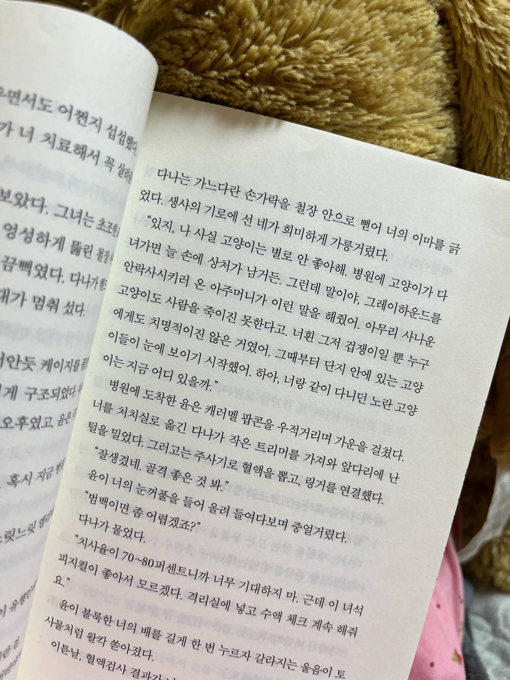 나는 윤을 원망하지 않는다. 그건 너도 그럴 터였다. 너와 윤은 한결같은 파트너이지 가족이나 친구는 아니었다. 그는 네게 무수한 상처를 남길 뿐 치명상을 입히지는 않는다. 그걸 이해하지 못하는 건 다나뿐일지도 몰랐다. 전화벨이 울렸다. 다나가 붉게 달아오른 얼굴을 세수하듯 문지르며 접수대로 향했다. 거즈로 눌러놓은 주삿바늘 자리에서 피가 배어 나왔다. 공혈 묘의 시간처럼 느리게 아주 느리게.