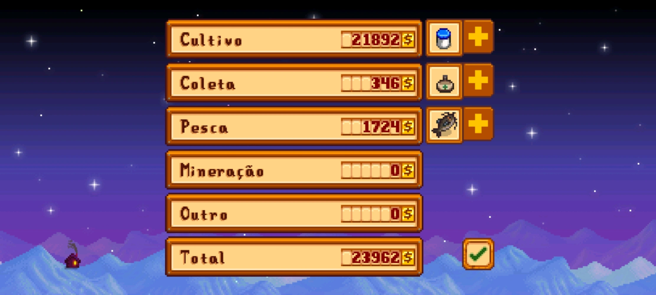esse inverno está sendo mais lucrativo do que no inverno passado! finalmente comecei a investir na minha fazendo p conseguir um dindin a mais e está dando certo. Já comecei a construir os lagos, fiz desidratadores, barris, máquina de maionese e consertei o barco. ainda tem mais coisas p fazer, tipo a plantação que eu preciso mudar de lugar e a casinha dos junimos, mas por enquanto está tudo andando muito bem!!