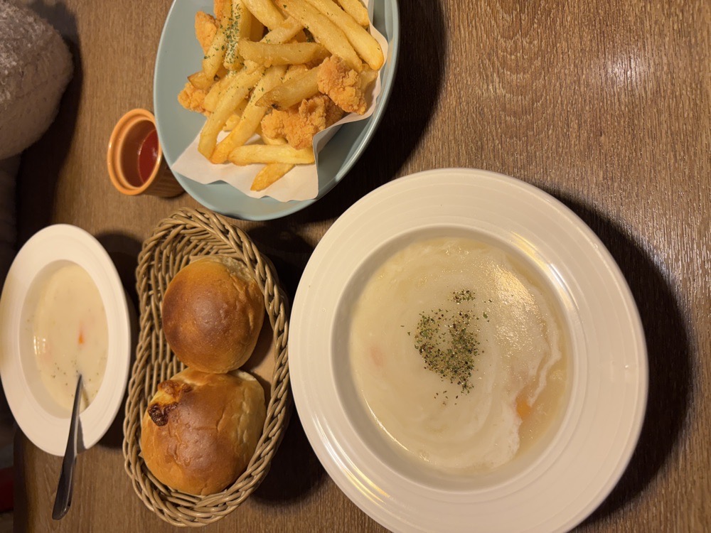 我跟草泥馬點雙人套餐| 套餐內容有:主食兩份+麵包+薯條雞米花+兩杯飲品+濃湯 麵包好像有一個是奶油一個是奶酥的,有點普通,濃湯還算好喝,蠻濃郁。 1. 綜合海鮮燉飯:海鮮都還蠻新鮮的,有蝦子、中卷、蛤蜊,帆立貝跟一些青菜,飯的部分也還不錯,好評。 2. 鮭魚乳酪披薩:起司很多好吃,但我不知道為什麼基底要用酸黃瓜,整體變成偏酸其他味道都被蓋過了,鮭魚味整個消失,他的餅皮是薄脆的那種,我跟草泥馬一致認為下次可以不用點這個。