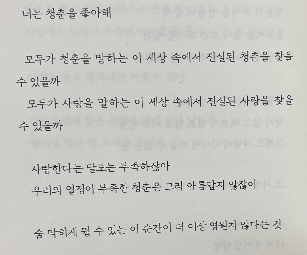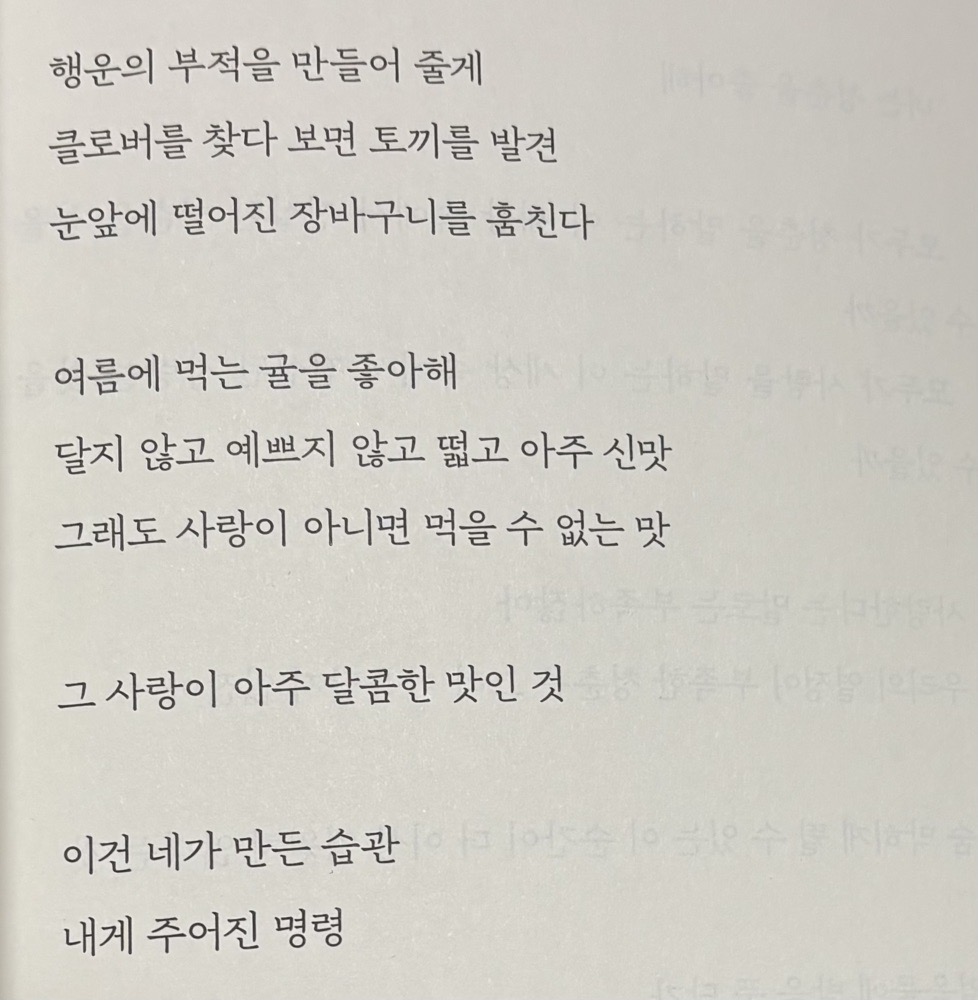 청량감 max 근래 읽었던 시집 중에 제일 술술 읽히고 머리아프지 않았던 책 귀엽고 톡톡 튀는 시가 많음! 여름, 사랑, 우리, 너!