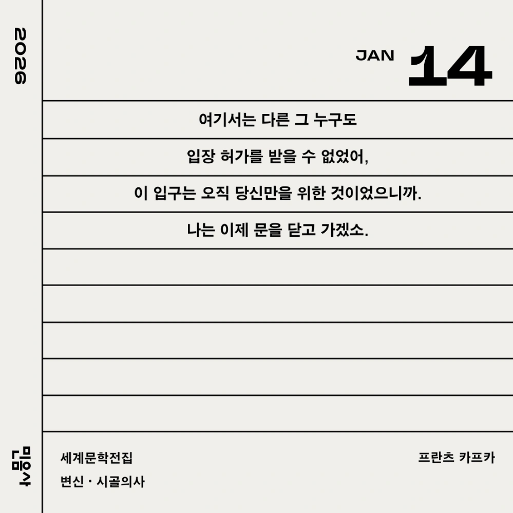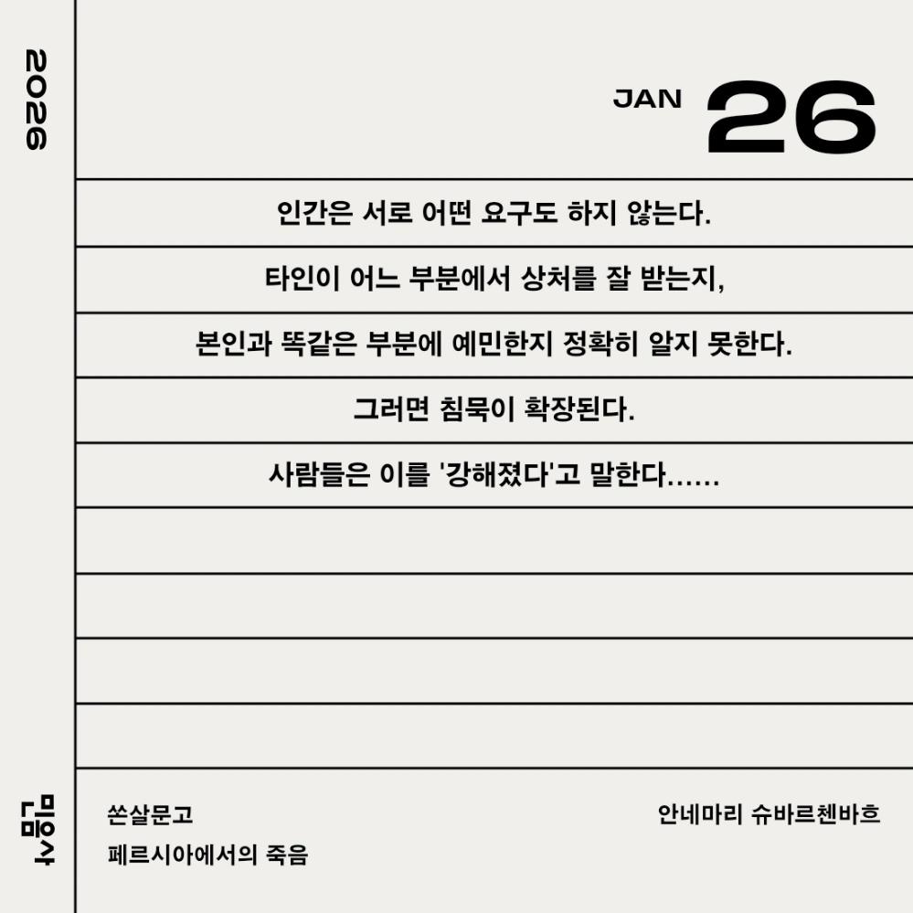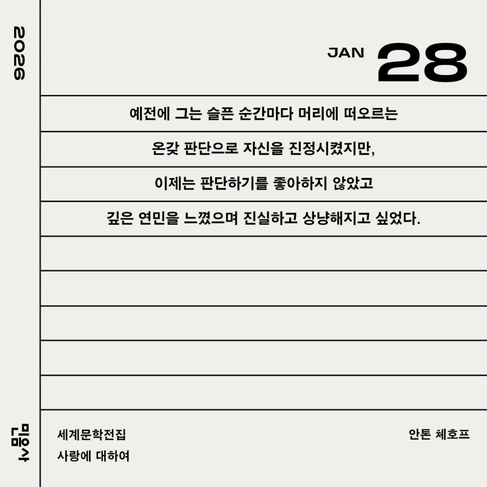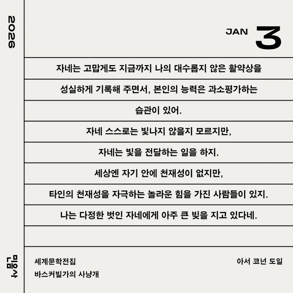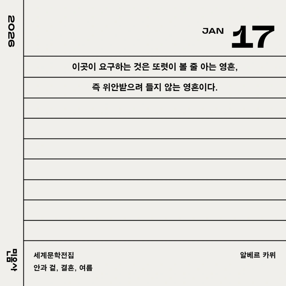 민음사 일력을 쓰고있다 작년 것도 좋던데 미리 알지 못한 게 아쉬움 1월의 문구 중 마음에 들었던 것만 모아보기 1. 셜록 홈즈는 내가 오타쿠가 되게 만든 책이기도 하고(ㅠㅠ) 반가워서 하트 누름ㅋㅋㅋㅋ 사실 저 말 되게 재수없는 거 같으면서도 ㄹㅇ 천재인 친구가 어시?인 나한테 저런 말을 하면 왠지 감동할 것 같기도 하고?ㅠㅠ 킹받는데 다정해(ㅋㅋㅋㅋㅋㅋ 2. 이건 문학과 사회였나... 뭔가 교양수업 때 처음 읽었었는데 그때도 지금도 사실 무슨 내용인지는 이해가 잘 안 감 하지만 왠지 지잉~ 하고 오는 게 있음 3. 나 사실 카뮈 하나도 안 읽어봤는데(부끄) 뭔가 찔린다고 생각함 4. 나도 가끔 그렇게 느낄 때가 있어서 하트를 누름 5. 실제로 무슨 맥락인진 모르겠지만 죄가 그냥 말하고 말로 용서받을 수 있는 일이라고 생각하는 사람은 그 구원도 결국 그 정도에 불과하단 말이 아닐까 생각하고 공감햇음 아닐시 아님 6. 나 분명 어릴 때 1984 읽엇는데 거짓말처럼 기억 안남 걍 이거만 보고 느낀 걸로는 사실 완전 공감가진 않는데(ㅋㅋ) 사람이 이해받길 바라는 것도 어떤 의미의 사랑을 추구하는 거라고 생각해서... 근데 그냥 오타쿠적으로 좋아서 찍음 -오타쿠- 7. 매우 공감됨... 8. 이것두... 나도 어릴때(초중딩 막 이럴 때)는 이성적인 게 냉철한 거고 바람직한 거라고 생각하고 T부심있고 이랫는데 요샌 그냥 "진실됨" 이게 짱이라고 생각됨 ㅋㅋ전 사실을 말한건데요? 긁? 이딴거 말고 ㄹㅇ 나의 마음에 진실하고 솔직하고 남의 마음도 그렇게 진심으로 대할 수 있는 게 최선인듯