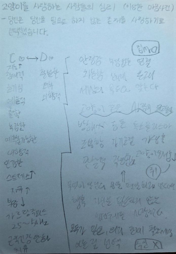 ▶️ youtube 이상한 마음사전 - 고양이를 사랑하는 사람들의 심리(당신은 당신을 필요로 하지 않는 존재를 사랑하기로 선택했습니다.) ⋆ ──────────── ⋆•。˚ ☾ ˚。⋆• ──────────── ⋆ 🐶❤️ VS 🐱❤️ 활발한. 예술적 외향적. 내향적 외부. 철학적 에너지. 호기심 복잡한 민감한 관찰력 스트레스 ⊹ ───/ᐠ - ˕ -マ Ⳋ─── ⊹ 부담감 없는 연결이자 존재이다. ⊹ ───ଘ /ᐠ - ˕ -ྀིマっ─── ⊹ 고양이의 가르릉 거리는 소리에 신경계가 이 세상에 속도와 맞춰진다는 느낌이 들어 안정감을 느낀다고 한다. ⊹ ───≽^•⩊•^≼─── ⊹ 실제로 고양이의 가르릉 거리는 소리는 치유능력이 있다. 근육긴장이 약화되는 주파수인 25~50Hz이다. ⊹ ───₍^. .^₎⟆─── ⊹ 고양이를 좋아하는 사람일수록 관찰력과 지능이 높아 작은 변화도 빠르게 알아채 쉽게 피로감을 느낀다. ⊹ ───/•᷅•᷄\୭─── ⊹ 그럴 때 고양이는 그저 가만히 내 곁에 앉아있는다. 나에게 그 어떠한 것도 요구하지 않은 채. ⊹ ───₍^˶ ╸𖥦 ╸˵^₎⟆─── ⊹ 이 세상은 필요하고 의지할 수 있는 관계를 찾도록 요구하지만, 만약 당신이 다른 걸 선택한다면, 당신은 편안해질 것이다. ⊹ ───ฅˆ‧⩊‧ˆฅ─── ⊹ 즉, 자신을 필요로 하지 않는 생명체를 사랑하는 것이다. +++개를 키우는 사람은 '주인'이고, 고양이를 키우는 사람은 '집사'이지 않는가? 나처럼 쉽게 지치는 사람에게는 부담없는 관계인 집사가 더 나은 선택일지도? ⋆ ──────────── ⋆•。˚ ☾ ˚。⋆• ──────────── ⋆