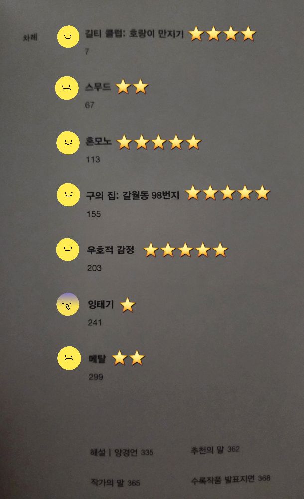 "저물어 가는 것들도 미래를 꿈 꿀 수 있다." 🎸<메탈> "그 말을 제대로 듣지 못한다. 그리고 당신도." "가만 보면 저 양반이나 너나 꼭 닮았어." "사랑에 갈급해서 제가 받지 못한 걸 죄 자식에게 쥐어주려고 하잖니." "저 양반도 일생 부모 정 못 받고 살아온 사람이야. 나도 그랬다고 하지 않았니? 아가, 난 말이다, 결핍이 집착이 되면 안 된다고 생각한다. 애정도 적절히 내어줄 줄 알아야 해." 🧓<잉태기> "하기야 존나 흉내만 내는 놈이 뭘 알겠냐만, 큭큭, 큭큭큭큭." 😵💫<혼모노> 수잔 : "알렉스 너무 애쓰지 마요. 애쓰면 더 멀어져." "나도 이 회사 처음 들어왔을 땐 알렉스랑 비슷했어요." "겉으로는 다 좋아보여도 속은 다 썩어 있어요." 알렉스 : "외따로 떨어지거나 적응을 못하는 이들에게 먼저 손을 내미는 것. 그것은 내 오랜 습관이었다. 그런 나에게 가까운 친구들은 왜 네 몫도 버거워하면서 남까지 챙기느냐 핀잔을 주었지만, 그럼에도 어쩔 수 없었다. 호의적인게 나쁜 걸까, 의문이 들기도 했고." 🤔<우호적 감정> 구보승 : "어떤 관점에서 보느냐에 따라 다르겠지만, 저는 인간을 위한 공간이라고 생각합니다." "인간에게는 희망이 필요합니다." "빛이 인간에게 희망뿐 아니라 두려움과 무력감을 안길 수도 있다는 것을요." ⛓️<구의 집 : 갈원동 98번지> † ─────┈┈๑⋅⋯ ༺ 𓆩𓆪 ༻ ⋯⋅๑┈┈───── † [희망은 긍정의 상징으로 널리 알려지고 수없이 많이 표현됐지만, 혼모노에선 오히려 희망으로 인해 인간이 더 고통받는 상징으로 나타내는 게 소름돋았다.] 구의 집 : 갈원동 98번지, 단연코 1위🏆🏅🎖 [우호적 감정의 주인공인 알레스랑 나랑 성격이 비슷해서 읽는 내낸 재미있었지만, 안쓰러운 면도 있었다. 역시 회사은 비즈니스인건가? 페르소나 가면을 쓰고 일하는 어른들을 보면서 나쁘게 생각했는데 오히려 회사 내에서 나의 자아를 들어내면 '나'를 잃을 수도 있겠구나 생각했다. 순수하고 여린 내 마음을 지키려면 가면을 쓰고 일해야 하는 것 같다.] 우호적 감정도 공동 1위🏆🏅🎖 [바나나맛 우유와 바나나 우유의 비유는 정말 생각지도 못한 부분이였는데(누가 이런 생각 할까?) 비유를 찰떡 같이 해서 읽는 내내 추리소설 같아서 너무 재밌었다. 나도 성해나 작가처럼 비유를 잘하는 사람이 되고 싶다.!!!] 혼모노 역시 1위ㅋㅋㅋㅋ🏆🏅🎖