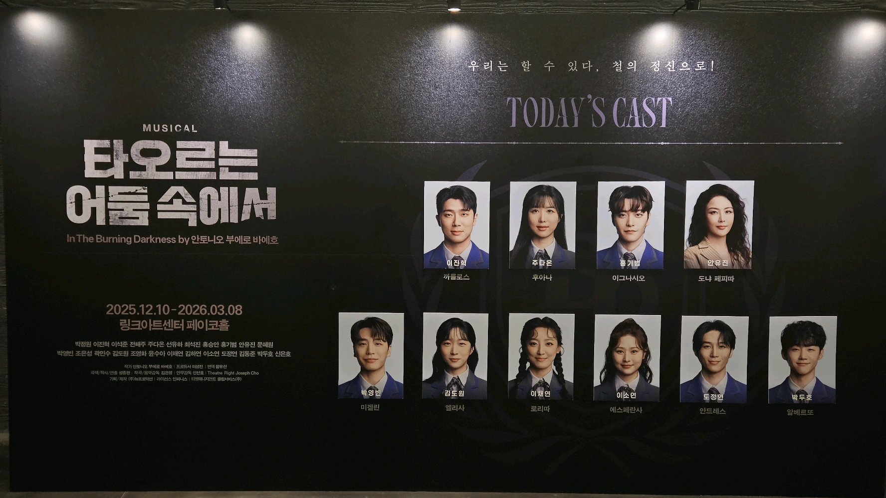 타오르는 어둠 속에서 자첫 26.02.15 낮공 이진혁 홍기범 페어 오오 드디어 봤다!!! 토요일에 급하게 구해서 보고옴 왜냐면 남은 2월이 너무바빠서, 더이상 관극은 힘들것 같았기 때문... 일단 정말정말 취향인 극이었다...🥹🥹 난 배우들의 무대 동선을 통해 연출하는 극을 참 좋아하는데, 타둠이 딱 그랬음.... 그리고 생각할 거리도 참 많은 극이었음 특히나 2막 중간에 전체 암전되는 씬이 정말 인상깊었음....ㅜㅜ 암전된 상태로 배우들의 노래가 계속되는데 진짜 울컥했음 넘버도 진짜 좋더라고요.... 저는 극이 마음에 들면 플북을 사는데, 인터미션때 나가서 플북사옴 그만큼좋았음