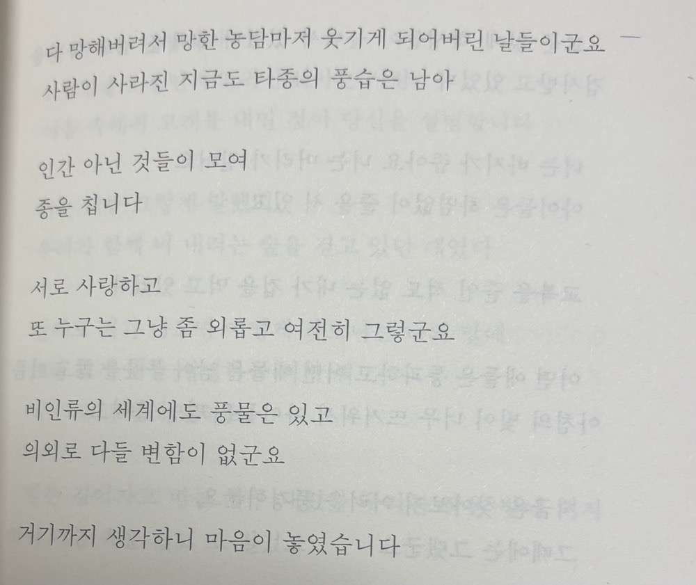 현실과 꿈, 아니면 그 어떤 어딘가로 끌려 들어가는 느낌 툭툭 던지는 말에 사랑이 있고 마음이 있다. 서로 사랑하고 또 누구는 그냥 좀 외롭고 여전히 그렇군요 단순하고,영원한 문장들이 좋았던 책