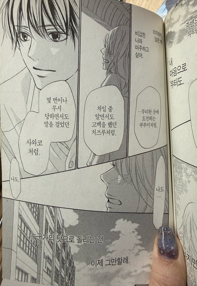 드디어 다봤다!!!!!!!! 완결 봤는데 너무 재밌다 ㅜㅜ 졸업식때 내가 졸업 한거마냥 울엇음..;💦💦 너에게닿기를 왜 좋아하지? 생각해봤는데 1. 순정만화인데 여주가 안불쌍함. 부모님 사랑 듬뿍받고 잘큼 2. 소년만화처럼 성장이랑 우정 같이 교훈을 많이 줌 3. 카제하야가 껍데기뿐만 아니라 성격이 너무 진국..... 4. 치즈 아야네 성격이 너무 좋고.... 그들의 관계와 서사가 너무 특별함 ㅜㅜ 5. 캐디가 너무 잘됨... 미운 캐릭터가 없음 모두의 마음이 이해가 가..... 근데 하나도 안 현실적이게 부정적인 감정이랑 긍정적인 감정을 잘 표현함 6. 너닿 세계관에서... 살고싶다............... .... 카제하야쿤 이마 도코? ㅜㅜ 핀... 진짜 아야네랑 아니야...? 아야네를 제일 좋아하는+아픈손가락 느낌의 제자같이보였는데 아무리 좋다해도 끝까지 넘어오지 않는 핀 너무 좋고.... 실패할걸 알면서도 고백하려다 망설이는데 그때 치즈랑 사와코가 힘내!! 라고 응원해준거 주마등처럼 스쳐지나면서 다시 실패하더라고 고백하는,,, 아야네가 너무 좋아요................ 뭔가 또... 얘네가 대학가서 얘네같은 친구가 안생길걸 알아서 더 좋다,,, 그 나이때만 가능한 우정,,,,,이라는게,,,, 너무좋아.........ㅠㅠㅠㅠㅠㅠㅠㅠㅠ 아니 치즈류 결혼하는걸 안보여준다고? 류오빠 오타니 뺨치는 세계적 야구선수 되서 치즈언니한테 고백하는걸? 내가 작가였음 치즈언니 모델시켯음 ㅜ 진짜....ㅠㅠㅠㅠㅠㅠㅠ 흑흑 결말이 너무 애매해.... 12년 연재인데 뭔가 결혼도 안하고.... 너무 예상가능한 근미래? 만 보여주고 완결난 느낌 너에게 닿기를만 줄수있는 특유의 중간중간 감동은 너무~ 좋지만 결말이 조금 아쉽다 ㅜㅜ 먼미래도 보여줘....