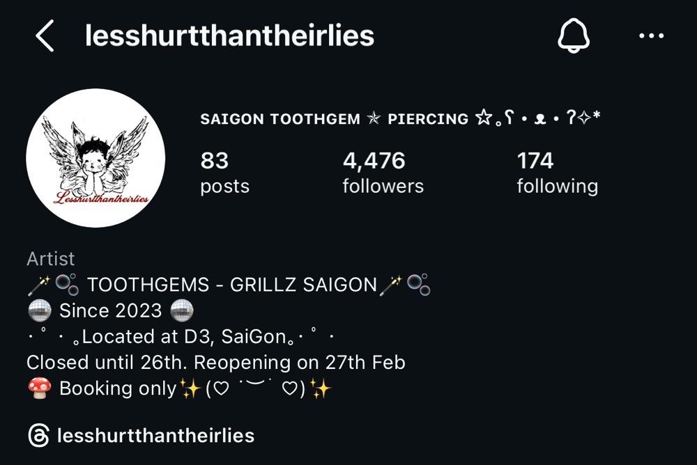 im such a fiend for teef gems, especially when theyโre cheaper than $30 a gem and so intact that i wont end up swallowing them like when i get them done in the states. main reason why i went back was to get my teeth molded for โจ grillz โจand so the newer gems were a second thought-ish. if yall ever get to travel to saigon and want tooth gems that will be super inexpensive but also secure as balls, hit her up. sheโs the only tooth gem artist iโve been able to find here by using social media and tiktok and yall know tiktok got it all.