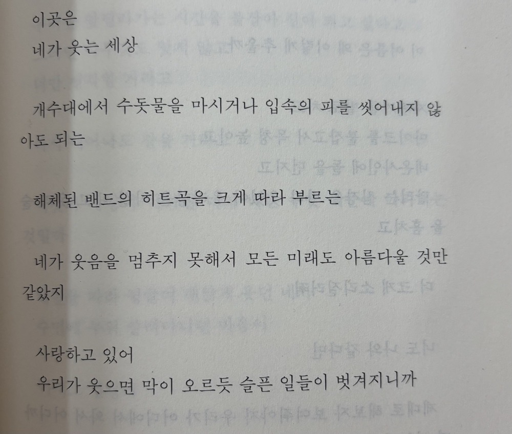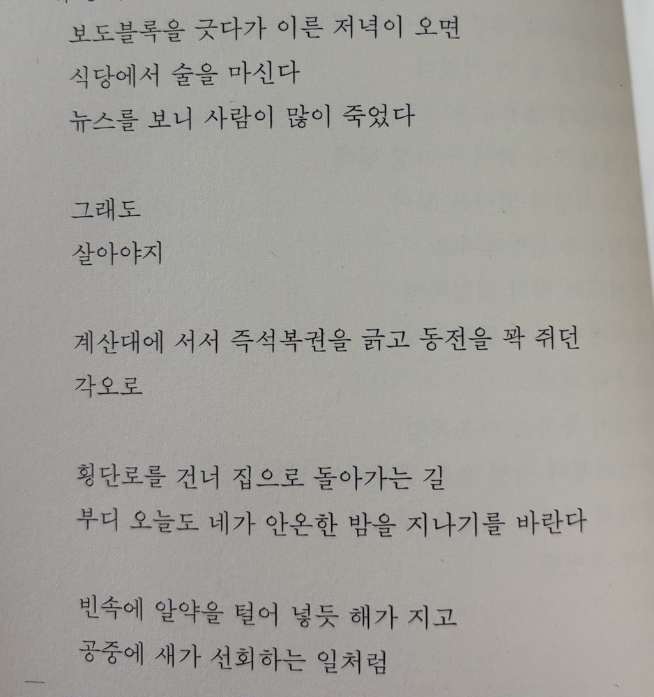 글이 직접적이어서 크게 해석하려고 노력을 안 해도 되고 술술 읽혀서 좋았음. 하고 싶은 말이 뭔지 알겠음 근데 지나치게 솔직하셔서 자서전이나 에세이에서 볼 법한 자기 이야기들이 담거 있는데 이게 재밌고 흥미롭다기보단 대체 어떤 인생을 살아오신 거지.. 싶을 정도로 수위있고 크게 궁금하지 않은 얘기들도 있었음. 그리고 그런 이야기를 풀어내려면 감성적인 요소가 들어가는 시랑은 따로 분류해두셨을 필요가 있는게 되게.. 여름..사랑..아..! 하다가 사람 죽이는 법을 배웠다. 이런 시 다음으로 나오니꺼 어라? 싶음 또 자꾸 사회비판이나 정부가 어쩌구 해서 몰입 깨짐 그래도 마음에 드는 문장들이 꽤나 있었다!