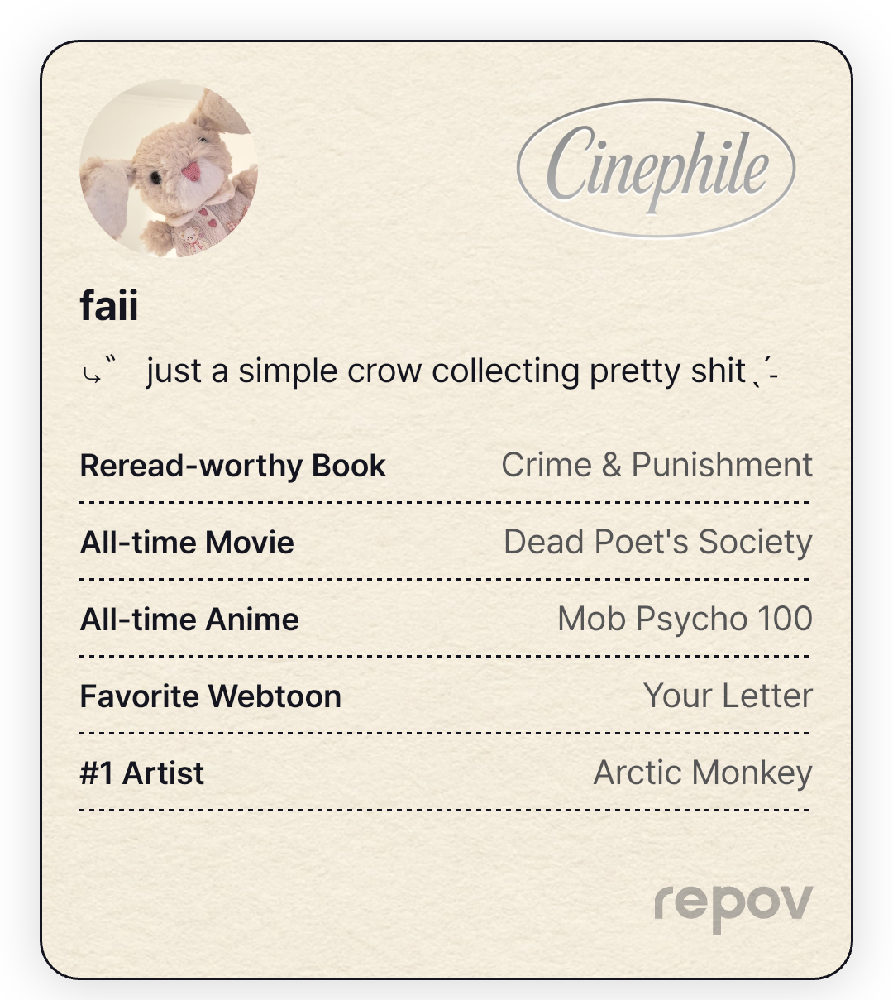 I've been looking for smth that can help me keep track of all the movies and books, cuz my goldfish brain can't remember all these titles... excel not pretty enough (or maybe skill issue) n then i found ゛REPOV ˎˊ˗ whoever made this gem, I'd love to buy y'all coffee someday (also cured my doomscrolling TT)