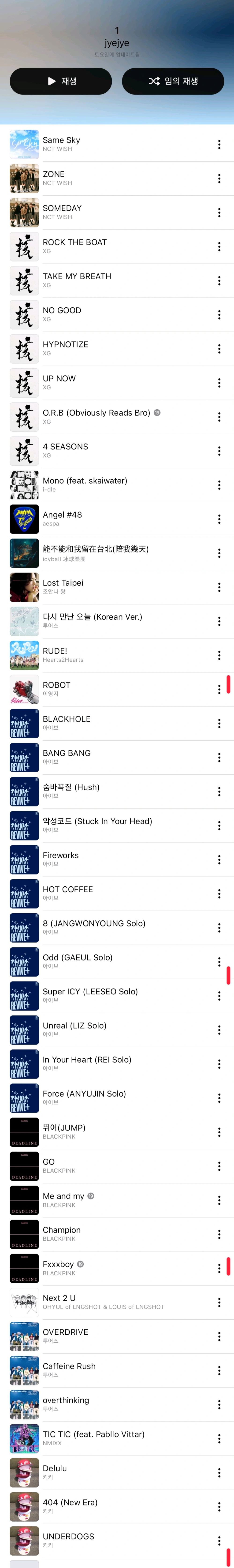 요즘 듣는 노래 따로 레포브 올리기 힘들어서 걍 씀 원래 듣던 거에 위시 뭔 싱글곡 아이브 전곡 블핑 영지 노래 엔믹스 추가함 아이브 노래 졔픽: 숨바꼭질(Hush) 악성코드 핫커피 오드