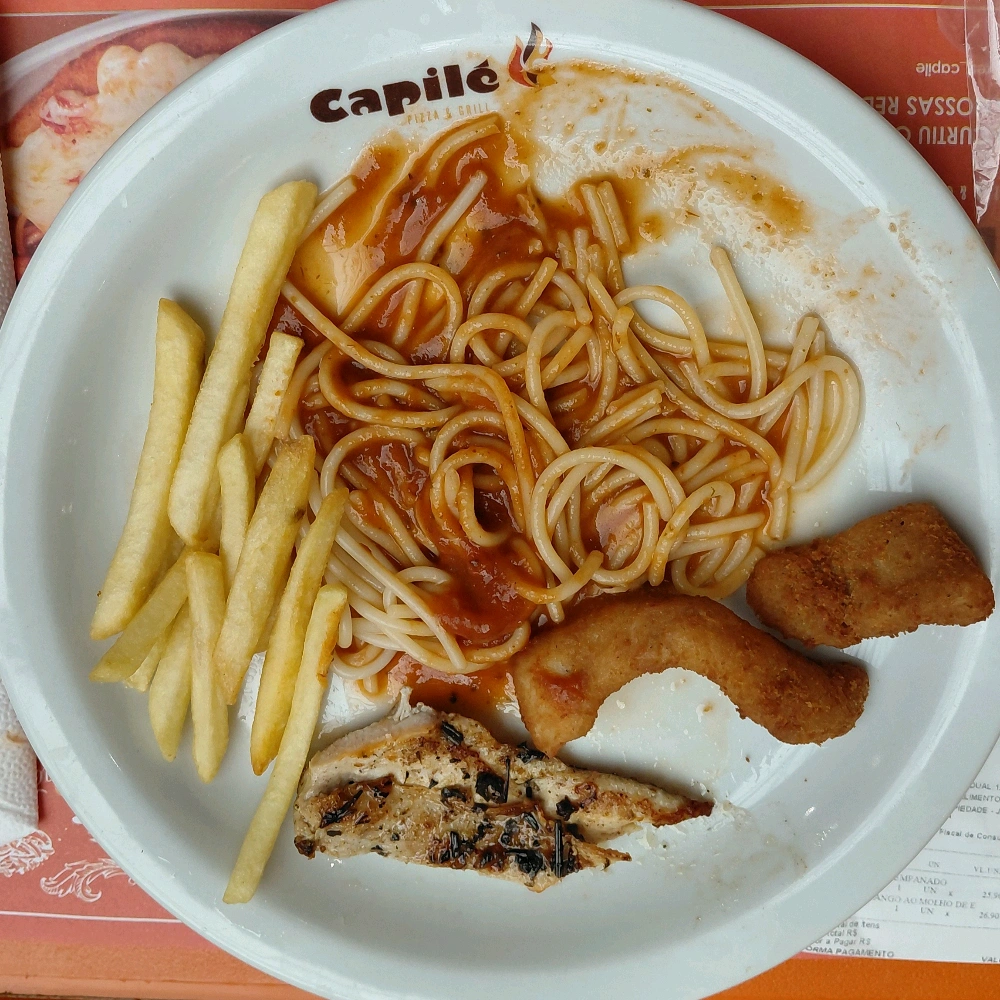 infelizmente, muito fraco. o molho do macarrão tava muito temperado e dominou todo o meu paladar. o empanado do peixe não era ruim, mas era um diferente estranho?! e peguei um pedaço do frango do prato da minha mãe e ela disse que tava mal passado. a única coisa decente foram as batatas. comi tudo porque tava com fome.