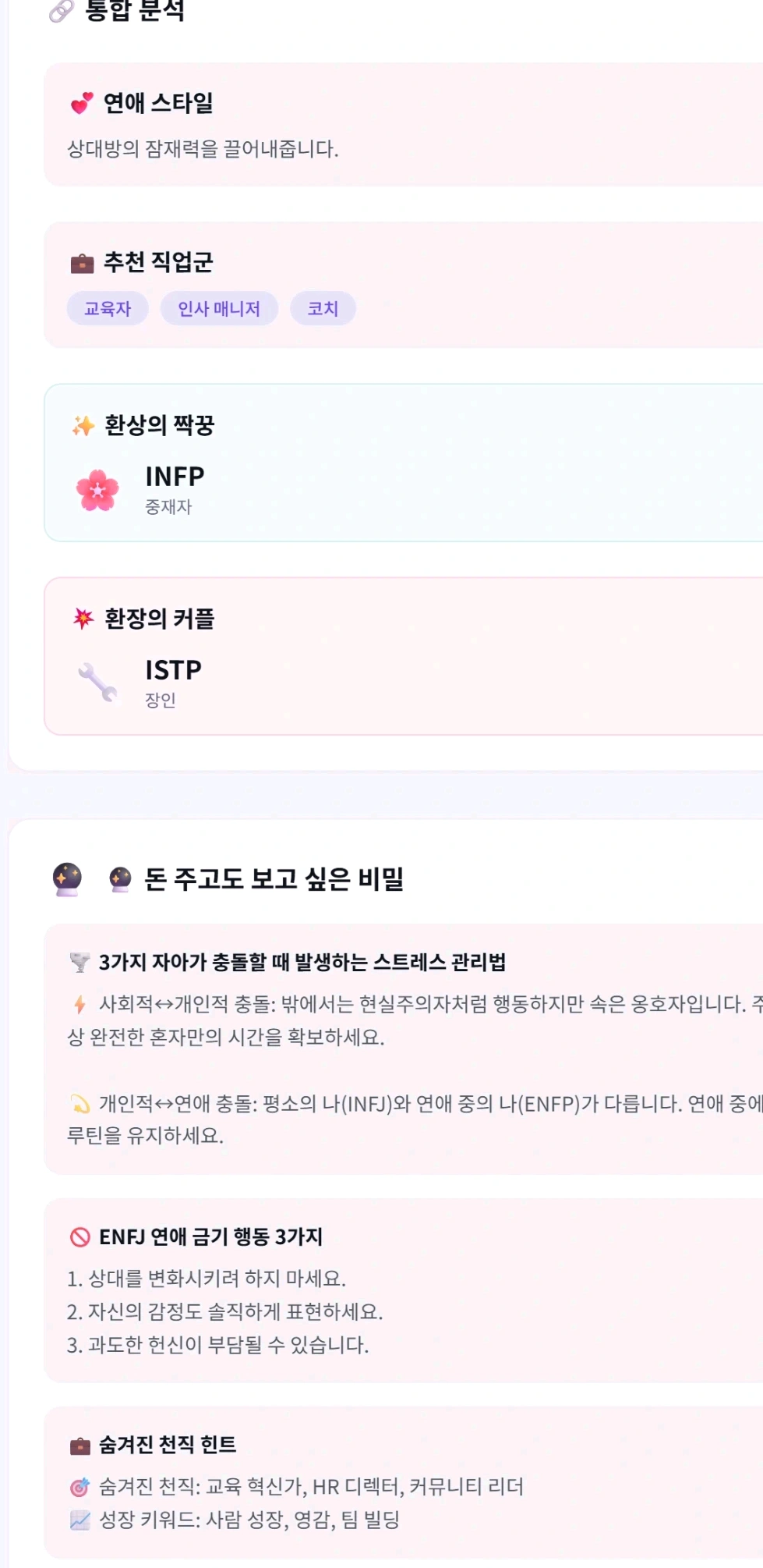 바이브 코딩으로 실험 삼아 웹사이트 만들었다 https://persona-spectrum-lab.lovable.app 바로 infj 나오는게 잘 만들어졌군 여러번 업데이트 하면서 테스트 해보니 infj intj enfj만 나왔다 질문 개수를 늘리면 더 정확해지려나 나중에 여러가지 기능들을 더 추가해봐야겠다 다음에는 바이브 코딩으로 내 전용 앱들 만들어봐야겠다