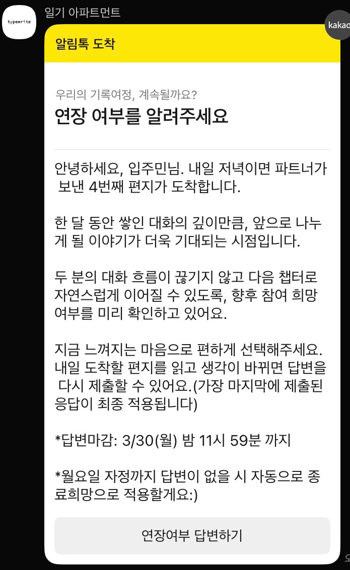 001. 4주차로 마무리 되었다. 나는 연장하지 않기로 했다. 002. 교환일기 상대분은 흥미로운 분이었다. 일기도 자주가 아니면 길게 쓰려고 했고 공통관심사가 밴드라는 점도 있었다. 하지만 시스템이 아쉬웠다. 첫주차 땐 각자의 일기를 쓰고, 2주차에 첫주에 쓴 상대의 일기를 받게 된다. 2주차에는 1주차에 대한 이야기+2주차의 삶이 담기게 되고, 이게 3주차 월요일에 전달. 상대에게는 이미 지난 이야기에 대한 답을 4주차때에 받게 된다. 이 부분이 매력적이지 않았다. 주제를 같이 가져가기엔, 기간이 길어서 맥락이 흩어지고, 그렇지 않기에는 혼잣말 하는 것 밖에 되지 않는다. 나는 비교적 자주, 길게 쓴 편이었지만 상대가 나의 바람에 상응하지 않는다면 그것도 꽤나 불만족스럽게 다가갈 것 같다. 짝궁은 한 달에 한 번 바꿀 수 있으니까. 같은 사람과 할 건지, 하지 않을 건지, 아예 그만 둘 건지. 마지막을 고했다면, 짝궁에게 쓰는 마지막 편지같은거 남길 수 있게 해줬음 좋겠다는 생각도 들었다. 아님 4주차 일기 마감 때에 이런 부분이 공지사항으로 있었다면 마무리 인사를 전할 수도 있었을텐데. 003. 그럼에도 불구하고 좋은 기회고 시도였다. 낯선 사람에게 내 하루를 정리해서 보낸다는 게, 즐겁고 설레기도 했다. 내 짝궁분이 모쪼록 봄을 잘 나고, 좋아하는 여름을 맞이할 수 있기를 기도한다. 고마웠어요!
