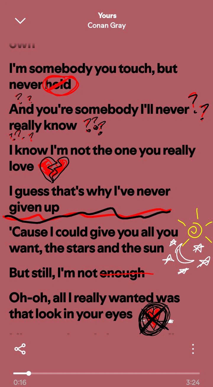 "Yours" by Conan Gray Im gonna be playing this one on repeat today. Can't exactly say why, but it deeply resonates with how Im feeling today.