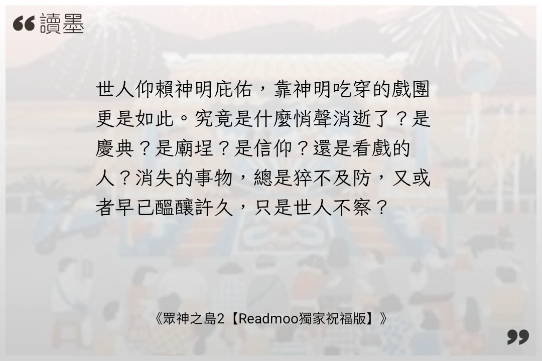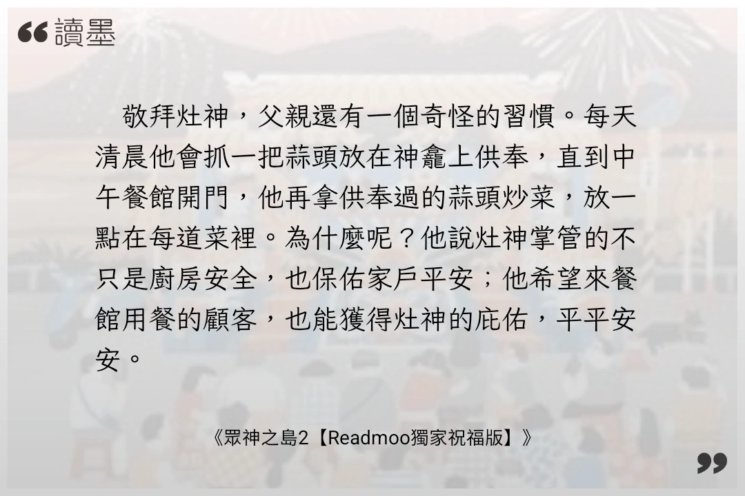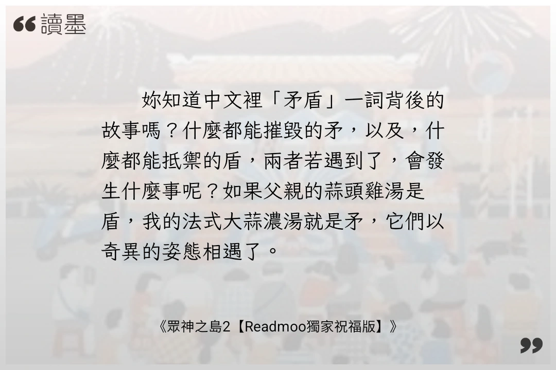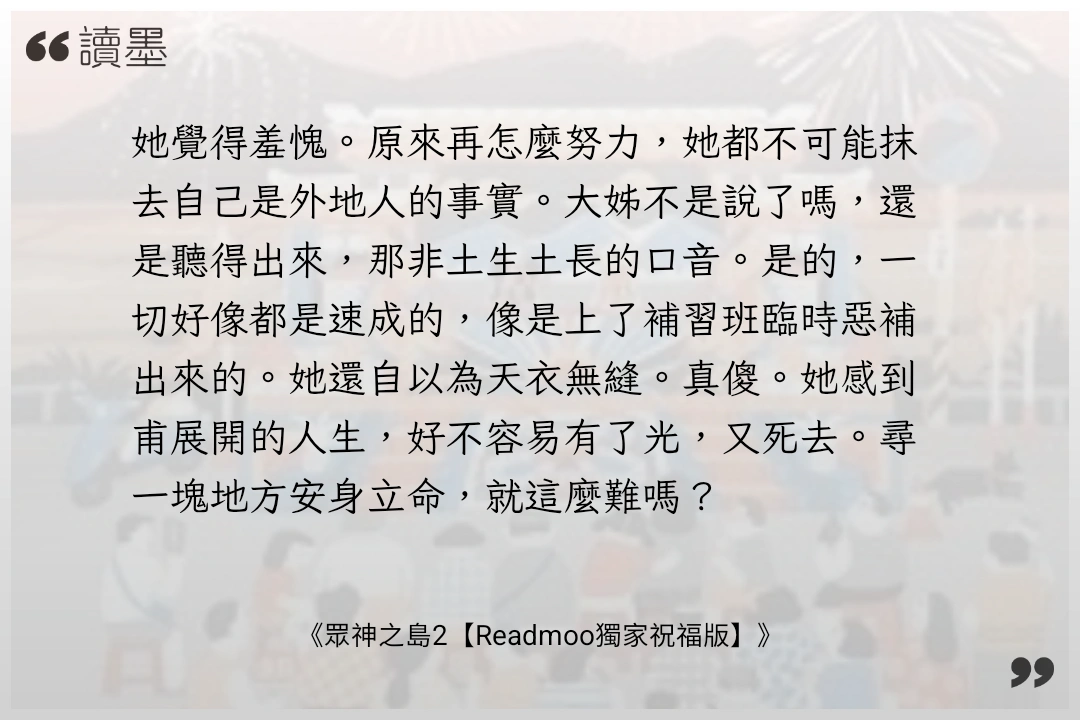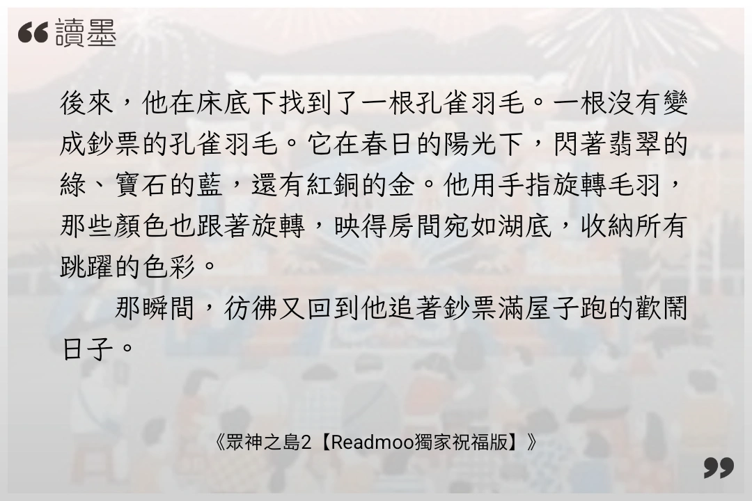 《眾神之島2》系列的第2部作品,一樣是很輕鬆易讀的短篇故事集。 其實有幾度,覺得這系列的圖書不太是自己的菜,但看著看著,也不知不覺就看完(閱讀時數約2個半小時)。 作者光風文字總會透露處一些溫暖的氛圍,這次6個故事中,藉由作者的包裝,也帶出一些小小議題的探討。 有出櫃子女與傳統家長觀念對立之戰、也有外配的身份認同問題、還有傳統技藝的生存哉問等。 如果按照6個故事,最喜歡的3個故事應該會是: 《L’Ail》,講著女兒性別認同,希望父親可以認同的短篇,用「灶神」與「廚藝」兩者串連起來,第一人稱故事的編排很巧妙,能看出主角頑強、倔強的個性,面對傳統觀念的挑戰與最終的和解。 《雨夜酬神》,這篇寫到哥哥因為失去妹妹的痛苦心情,彩色的世界走向黑白,同時家族堅持的布袋戲傳統漸漸式微,一切彷彿不再有希望,蠻多段落的敘寫很能夠共感。 《點燈》寫到外配秀蓮對自己的身份認同疑問與掙扎,,雖然是很輕的文筆,但對照現實生活中,臺灣人對歐美裔及日韓的崇拜,而對上東南亞、中國等國籍,卻骨子裡流露出自我優越感的矛盾情節,但其實,所有人都是新住民。 蠻喜歡作者後記寫的這段話: 六篇小說主角,各有各的難關,神明做的往往只有守望,真正能使人走出難關的,還是人自身的力量;也因為經歷了無常,才明白那無聊單調的日常,才是最好最珍貴的。猶如金聖孔雀的羽毛,那般燦爛。