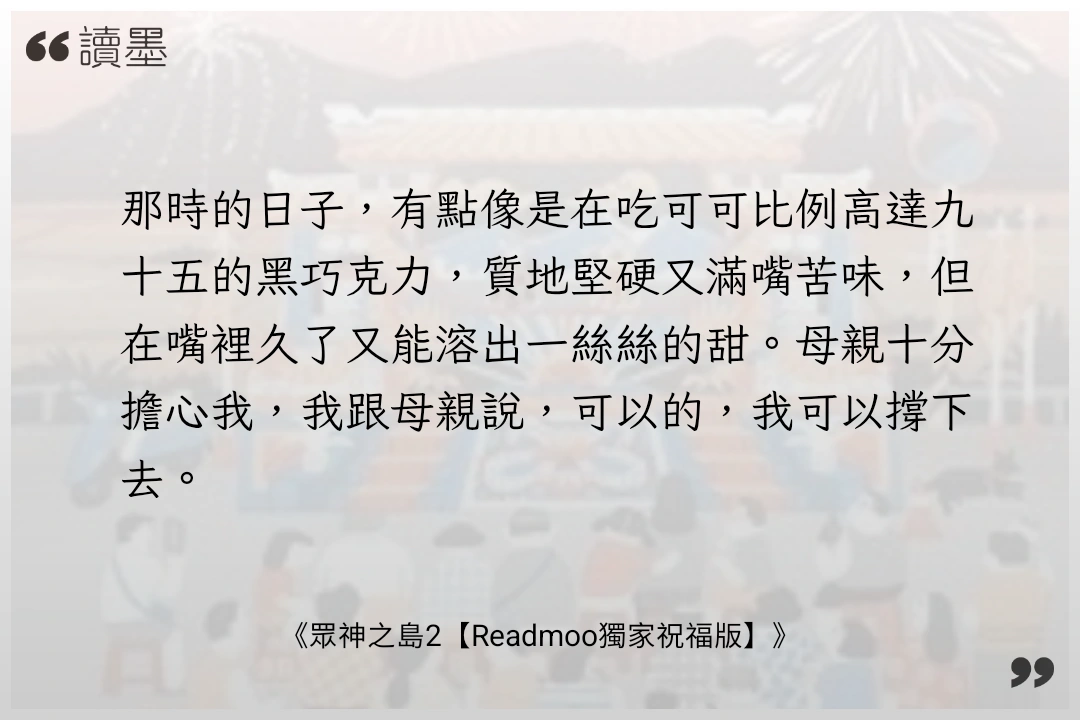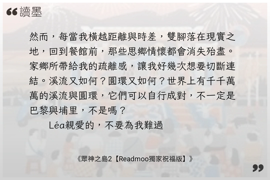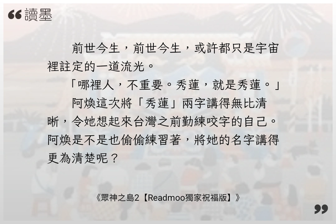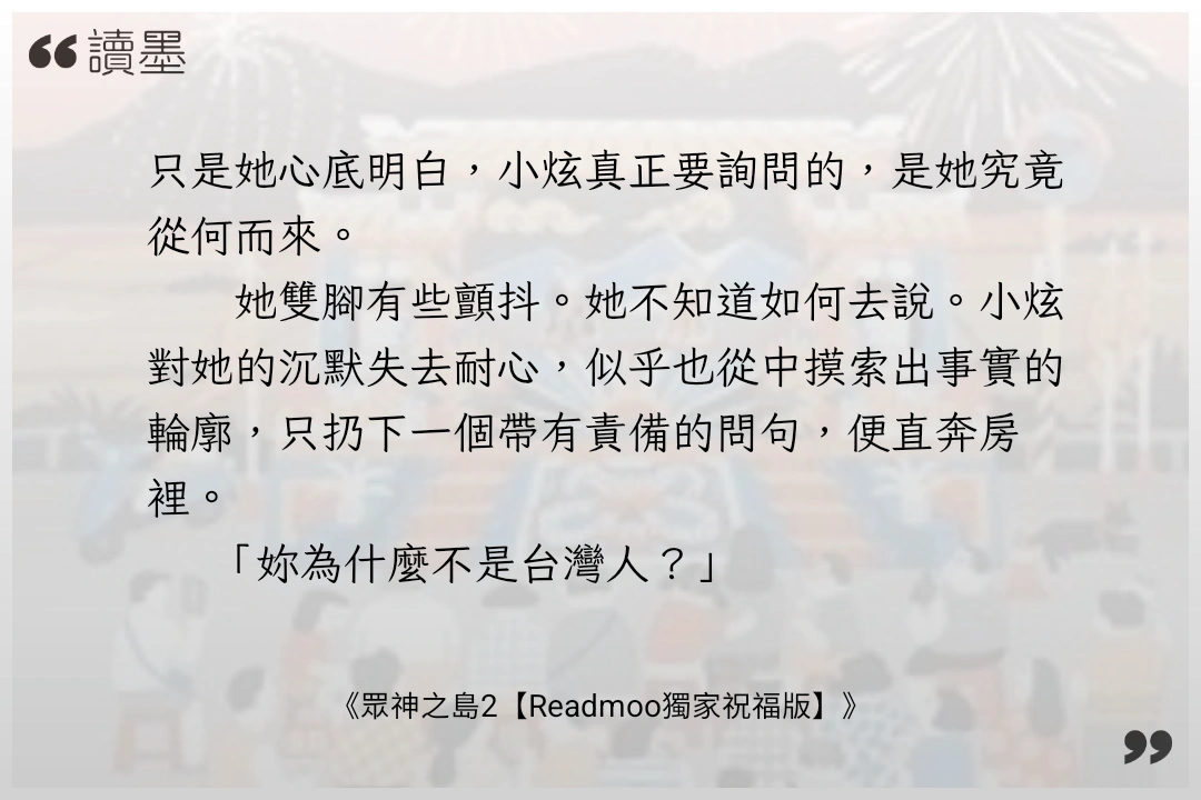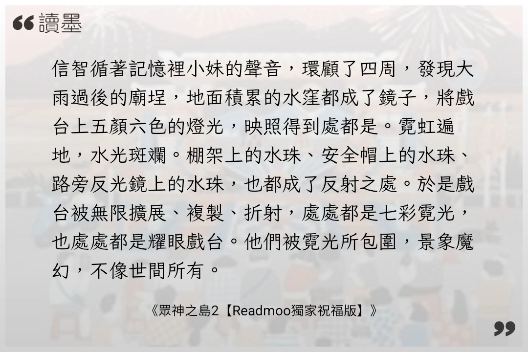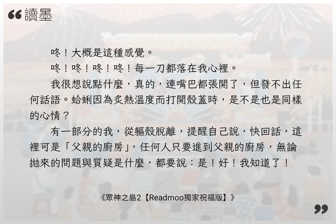 《眾神之島2》系列的第2部作品,一樣是很輕鬆易讀的短篇故事集。 其實有幾度,覺得這系列的圖書不太是自己的菜,但看著看著,也不知不覺就看完(閱讀時數約2個半小時)。 作者光風文字總會透露處一些溫暖的氛圍,這次6個故事中,藉由作者的包裝,也帶出一些小小議題的探討。 有出櫃子女與傳統家長觀念對立之戰、也有外配的身份認同問題、還有傳統技藝的生存哉問等。 如果按照6個故事,最喜歡的3個故事應該會是: 《L’Ail》,講著女兒性別認同,希望父親可以認同的短篇,用「灶神」與「廚藝」兩者串連起來,第一人稱故事的編排很巧妙,能看出主角頑強、倔強的個性,面對傳統觀念的挑戰與最終的和解。 《雨夜酬神》,這篇寫到哥哥因為失去妹妹的痛苦心情,彩色的世界走向黑白,同時家族堅持的布袋戲傳統漸漸式微,一切彷彿不再有希望,蠻多段落的敘寫很能夠共感。 《點燈》寫到外配秀蓮對自己的身份認同疑問與掙扎,,雖然是很輕的文筆,但對照現實生活中,臺灣人對歐美裔及日韓的崇拜,而對上東南亞、中國等國籍,卻骨子裡流露出自我優越感的矛盾情節,但其實,所有人都是新住民。 蠻喜歡作者後記寫的這段話: 六篇小說主角,各有各的難關,神明做的往往只有守望,真正能使人走出難關的,還是人自身的力量;也因為經歷了無常,才明白那無聊單調的日常,才是最好最珍貴的。猶如金聖孔雀的羽毛,那般燦爛。