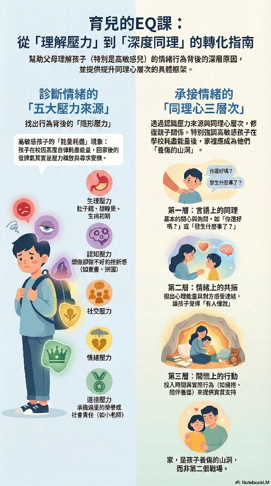 為什麼我要優化自己的 EQ 來讓別人爽? 這陣子很多人討論這部訪談,看完後覺得,不只育兒,以及高敏人,就算是一般人都很值得一看🥹 / 曾博恩和黃瑽寧醫師聊 EQ 跟親子教養。高敏感小孩不管在學校,或在家所承受的壓力真的不少。 黃醫師說:父母要學同理心,給孩子一個能放鬆、充電的溫暖空間💛 黃醫師還提出了五大壓力來源:生理、情緒、認知、社交、道德,還有「七比三」原則:在安全的範圍下給孩子自主,並透過成長型思維建立真正的自信,而不是自戀✨ / 提升 EQ 不是為了討好別人,而是建立穩定的生命能量💪 同理心除了生活也能運用在職場,找到愛的源頭,幫助自己調整心情。 / 說真的,我從來沒想過這件事:「為什麼我要優化自己的 EQ 來讓別人爽?」 我只想過——為什麼我的 EQ 總是這麼差🥺 前陣子我大概就像那隻飢餓的小蟲,還好後來發現了 repov,這裡的 user 感覺上大多心靈富足🥰 / 是說看到黃醫師提到的「共情三層金字塔」,才知道為什麼我每次都對宏哥那麼生氣😆 因為他只停留在「Level1. 言語的同理」🙄 / 雖然我的高敏沒有把我變成某領域的專家,但還好童年也沒被打壓造成反社會人格😆 / 希望我們都能找到自己的那片葉子 也有能力成為別人的葉子🍃