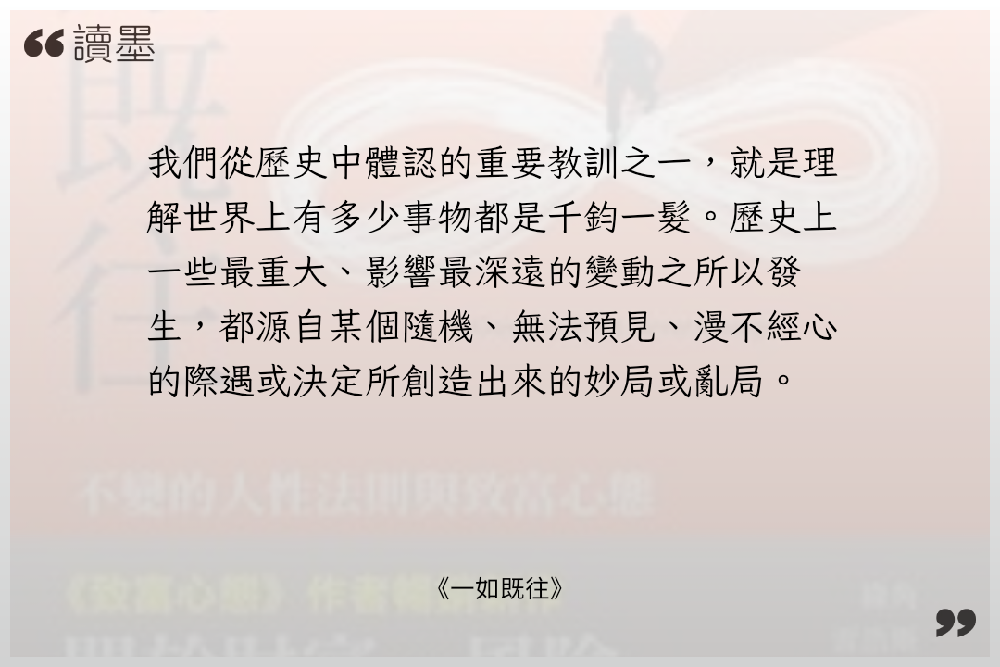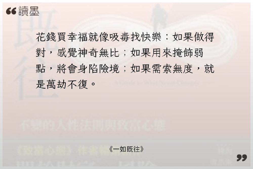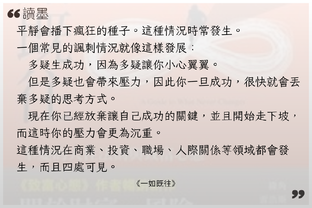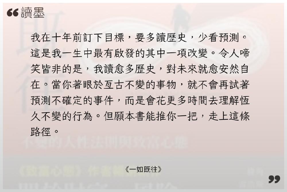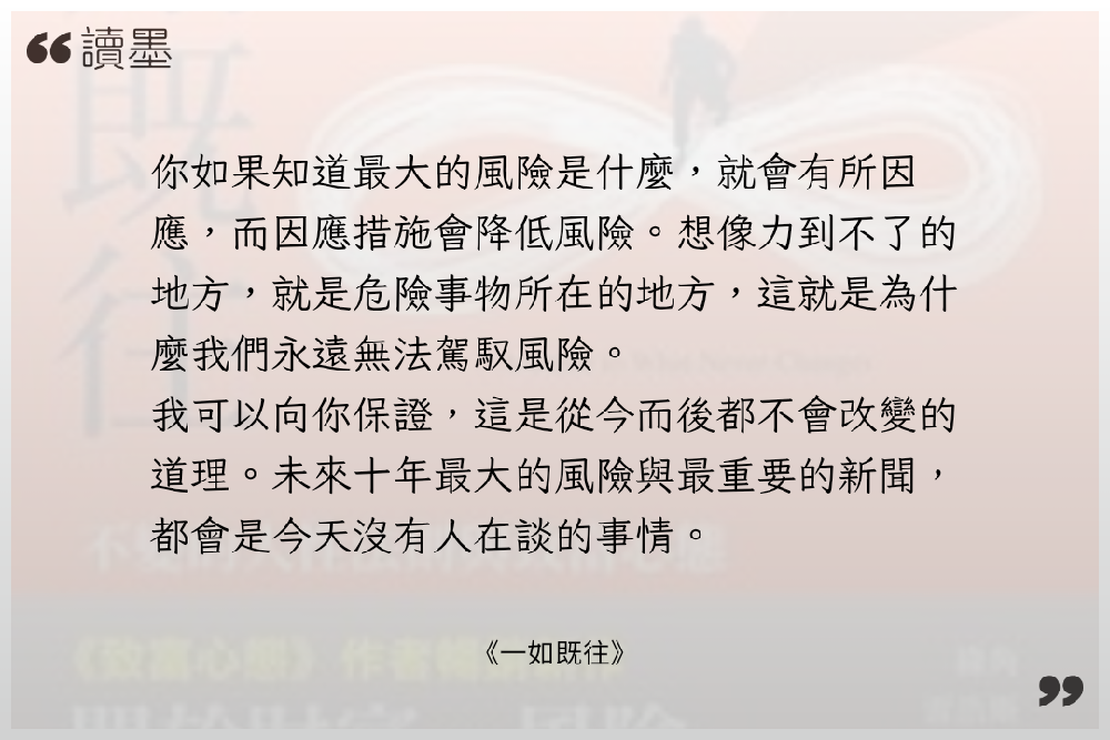 #雜感 因為換了閱讀器並且購入翻頁鍵後,有感自己的閱讀效率有提升,加上了repov這個平台,讓人會特別有意識地紀錄看作品後的想法。 但隨著購入的電子書越來越多,欠的書債也逐漸增加,有時看著那些還來不及開書的書,總有些壓力。 這時候反璞歸真,去重新看經典的作品,好像才是最佳解答。 《一如既往》就是這樣的書,Morgan Housel的說故事能力真得很優異,中文翻譯品質也非常好,如果投資小白時間有限只能看3本書,那我一定會直接說選這個作者的《致富心態》和《一如既往》,基本上,精讀,然後內化這兩本書,就絕對勝過看一堆其他的書籍。 《一如既往》在2024年出版時,就已經看完,當下帶給我很多心態上的新想法和建立比較可以抗風險及客觀的態度。 但時間久了,我也漸漸有些忘記書中的內容,而隨著新年期間,全球一片大好,AI、記憶體瘋漲,台積電破2000元大關,台股突破3萬5000點,比基本薪資還要高時。 冷不防,世界被潑了一盆冷水,截至紀錄當下,剛好3月結束,這一個月臺灣股市大盤修正了約12%,但主要是因為台積電還撐著,有一種「還好」的假像,而實際上許多個股已經修正了20%或甚至更多的狀態,整個世界的局勢也開始漸漸不再樂觀起來。 恐懼貪婪指數進入到「極度恐懼」的25以下。 2月還在幻想著,要靠著投資實踐人生自由,建立自己護城河,3月,老老實實當個社畜,認命看清自己的極限, 扯得有點太遠了,越是這種考驗心智的時候,重新再讀《一如既往》這本經典書籍,會發現,所有的事情都不斷地發生,一如既往。 有正確的認知、不隨波逐流,知道不確定性的狀況,知曉人性決策的盲點與弱點,能夠幫助自己釐清更多困境。