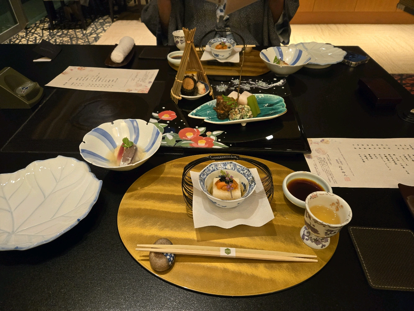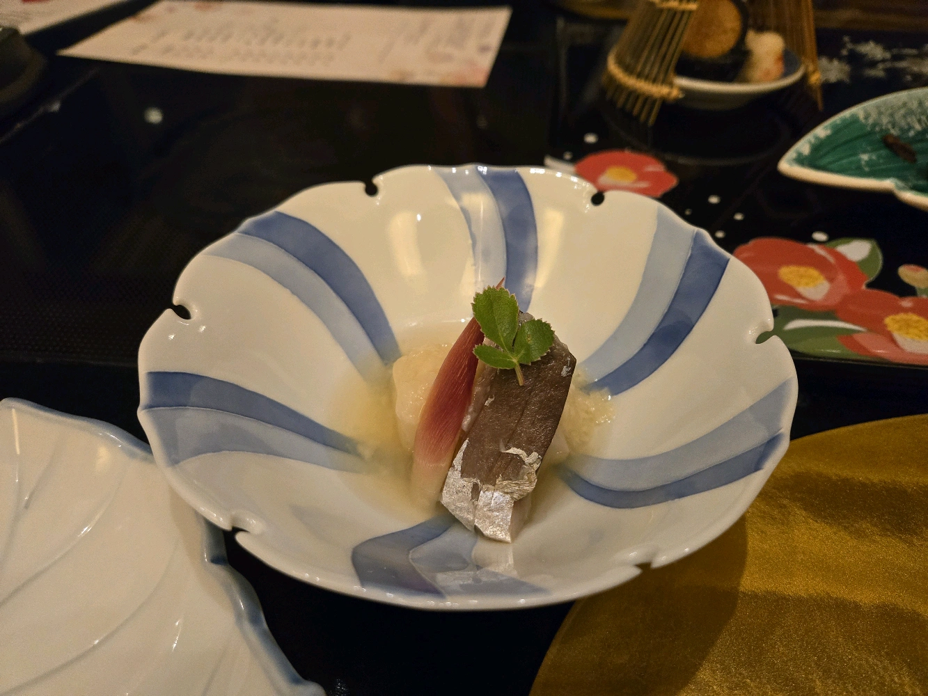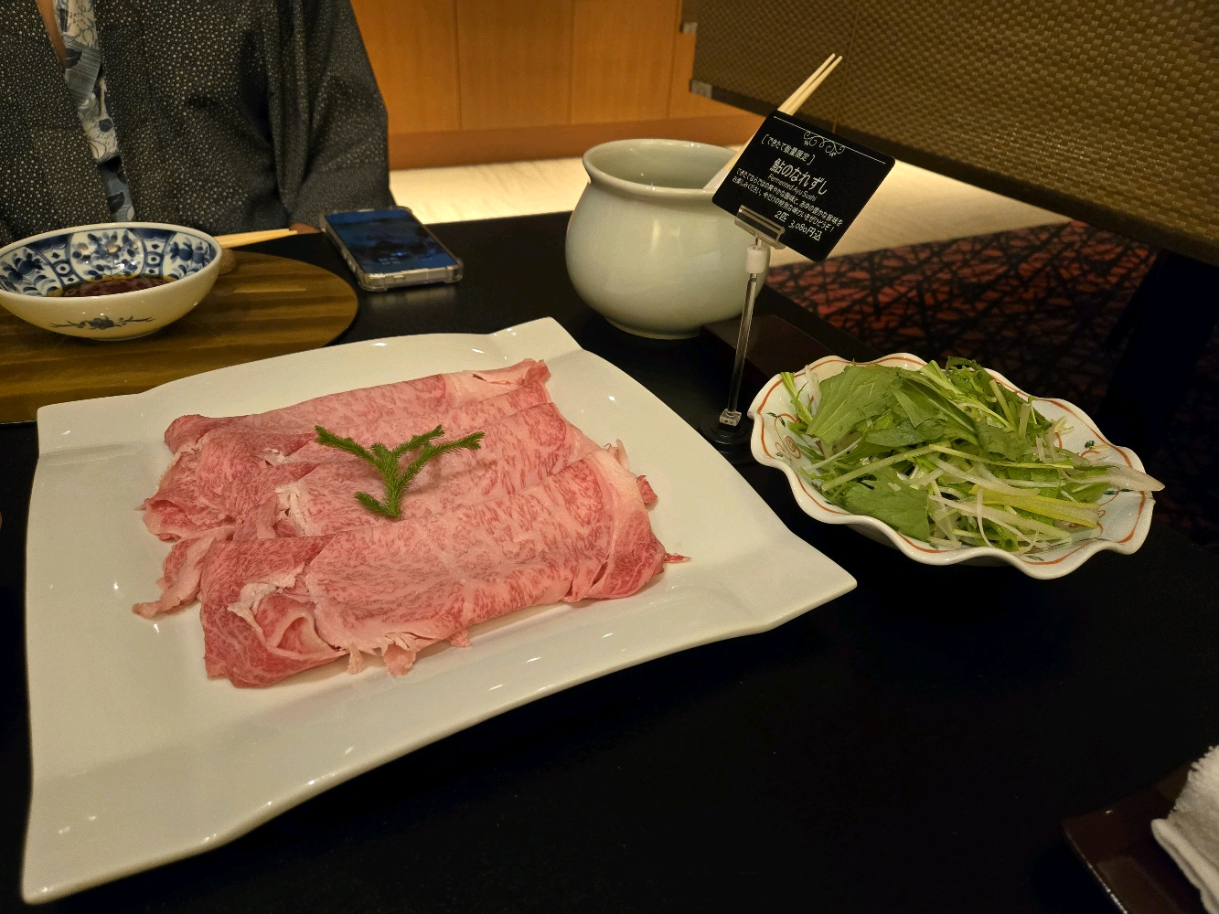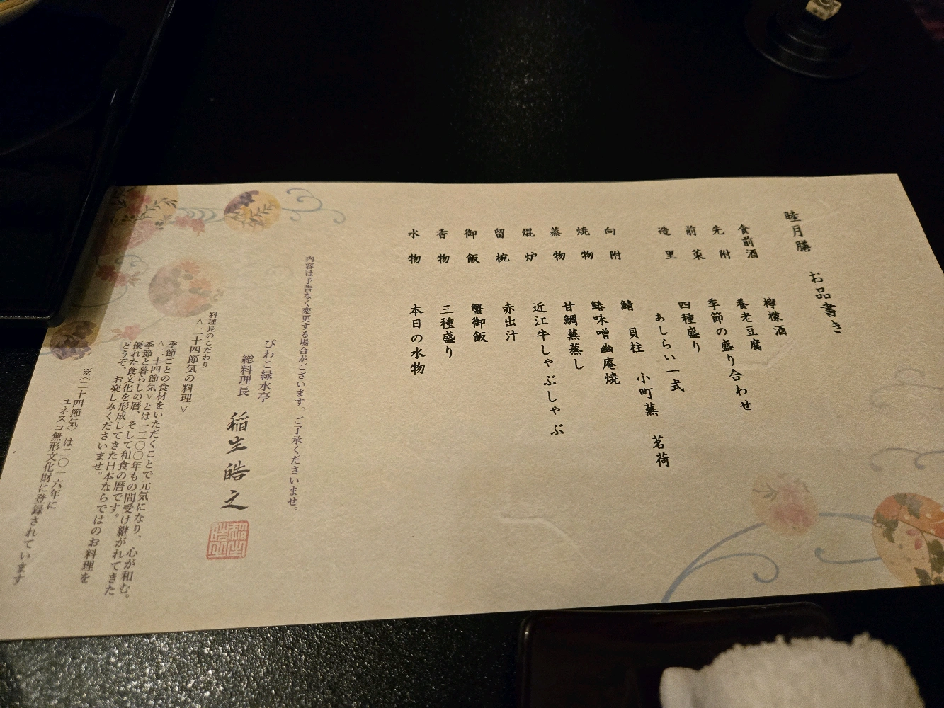 睦月膳 御品書き 睦月:日本舊曆的一月(正月)名稱,睦 むつき =和睦,帶有家人團聚、年初的溫馨氛圍。 使用當季食材(「二十四節氣料理」概念),希望讓人感受到季節變化、提供傳統日本料理的細膩風味。 / 🥂 ① 食前酒+先付(開場) 一開始的食前酒是檸檬風味,但其實是無酒精飲料,有點像氣泡飲的清爽感。這種設計還滿貼心的,就算不喝酒的人也可以一起進入用餐節奏。(孕婦友善! 先付「養老豆腐」,是一種用山藥泥(或山藥+高湯)做成像豆腐口感的料理。吃起來比想像中更細緻,上面再放上海膽和魚子,整體味道很柔。 / 🍱 ② 季節前菜拼盤 綠色葉片型瓷盤+後面小帳篷那道 內容大概是: 燉魚、白蘿蔔、青菜拌物(白和え)、魚卵壽司捲(小帳篷內)。 / 🐟 ③ 造里 四種盛り よんしゅもり 竹籃打開那組,是比較偏「原味呈現」的刺身拼盤,包含深紅色的鮪魚、粉白色的真鯛(或鰤魚)、花枝捲鮭魚卵。 裝飾:雪花蓮藕片(呼應一月冬雪)、紫蘇花穗、現磨生芥末。 あしらい 配角 / 擺盤配料 ・包含紫蘇葉、蘿蔔絲、檸檬片、花、葉子,或一些小配菜。 ・功能是提味(例如去腥)、增加層次、美觀。 一式(いっしき)= 一整套/全部 配料可能會依季節而不同,所以直接寫「一式」,就不用一個一個列出來。 / 🧺 ④ 向付 白色花型碗 是鯖魚和干貝的組合,搭配小町蕪(こまちかぶ,日本小白蘿蔔的一種)和茗荷(みょうが,日本薑,那片紅紫色的尖尖配菜)一起吃,味道比想像中有層次。 鯖魚的油脂比較重,但中間穿插一些清爽的配料,吃起來反而不會膩。 / 🍶 ⑤ 焼物 燒物是鰆的味噌幽庵燒,旁邊搭配玉子燒一起吃,味道多了一點甜味的平衡。 味噌幽庵焼(ゆうあんやき),一種日式經典燒法,醃料通常是:醬油、味醂、酒、柑橘(柚子或橙),有時會加味噌。 / 🍲 ⑥ 蒸物(甘鯛蒸し) 白肉魚甘鯛 上面搭一點山葵 清湯系 是一道偏冬季感的料理,以白肉魚(甘鯛)為主,口感很細緻,帶一點溫和的滑順感。 / 🥩 ⑦ 主角:近江牛しゃぶしゃぶ 日本三大和牛之一 (另外兩個是神戶牛、松阪牛) 來到滋賀縣琵琶湖這一帶, 一定要吃近江牛。 牛肉油花很漂亮,涮一下入口就化。 那一刻真的會覺得, 前面的鋪陳就是為了這一口😆 是說不知道為什麼桌上會出現「鮎のなれずし」(熟成香魚壽司)這個小立牌,但我完全沒印象有吃到😆 / 🍚 ⑧ 食事 蟹肉炊飯(釜炊き御飯) 赤出汁(紅味噌湯) 香物(漬物)三種盛り 炊飯帶著淡淡的高湯清甜。 中間那個白色小碟子上有一個金色的「巳」字,代表當年的生肖,很有收藏感。 / 🍧 ⑨ 水物(甜點) 草莓蛋糕+鮮奶油 水果(蘋果、葡萄)+ 布丁 草莓系慕斯 本來以為會是很日式的簡單小甜點,沒想到直接來一整套甜點拼盤,有夠驚喜😆 / 2026.04.06 回顧整理。 雖然是去年才去的,但不知道為什麼體感已經過了不只一年🥺